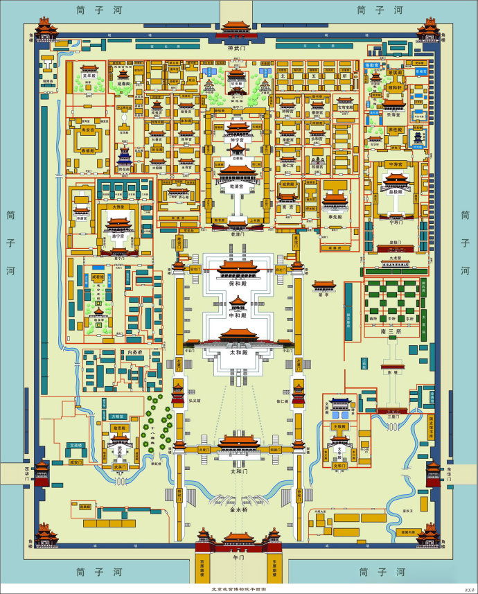 后门“神武门”,明朝时为“玄武门”,玄武为古代四神兽之一,从方位上讲,左青龙,右白虎,前朱雀,后玄武,玄武主北方,所以帝王宫殿的北宫门多取名“玄武”。清康熙年间因避讳改称“神武门”。神武门也是一座城门楼形式,用的最高等级的重檐庑殿式屋顶,但它的大殿只有五开间加围廊,没有左右向前伸展的两翼,所以在形制上要比午门低一个等级。神武门是宫内日常出入的门禁。现神武门为故宫博物院正门。
