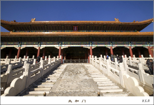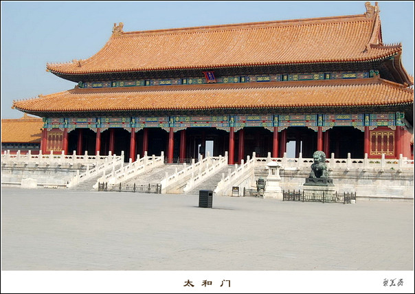 太和门是紫禁城外朝宫殿的正门。北京故宫最大的宫门。始建于明永乐年间,初称奉天门,曾一度改称皇极门。门内为太和殿(俗称金銮殿),堪称中国古代规格最高的门。现存建筑为清光绪十五年(一八八九)重建。面阔九间,进深三间,建筑面积一千三百平方米。重檐歇山顶,汉白玉基座,梁枋等彩绘。门前铜鼎四只,为明代铸造的陈设铜器。列铜狮一对,左雄右雌,威武凶悍,是故宫六对铜狮中最大的一对。