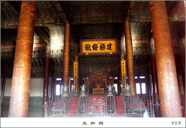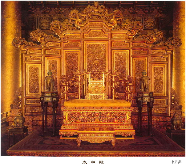 太和殿(明朝称奉天殿、皇极殿),俗称“金銮殿”,太和殿高35.05米,东西63米,南北35米,面积约2380多平方米。长宽之比为9:5,寓意为九五之尊。面积是紫禁城诸殿中最大的一座,而且形制也是最高规格,最富丽堂皇的建筑。太和殿是五脊四坡大殿,从东到西有一条长脊,前后各有斜行垂脊两条,这样就构成五脊四坡的屋面,建筑术语上叫庑殿式。檐角有10个走兽(分别为龙、凤、狮子、天马、海马、狻猊、押鱼、獬豸、斗牛、行什),为中国古建筑之特例。大约从14世纪明代起,重檐庑殿是封建王朝宫殿等级最高的形式。太和殿有直径达1米的大柱72根,其中6根围绕御座的是沥粉金漆的蟠龙柱。殿内有沥粉金漆木柱和精致的蟠龙藻井,殿中间是封建皇权的象征——金漆雕龙宝座,设在殿内高2米的台上,安放着金漆雕龙宝座,御座前有造型美观的仙鹤、炉、鼎,背后是雕龙屏。太和殿是故宫中最大的木结构建筑,是故宫最壮观的建筑,也是中国最大的木构殿宇。整个大殿装饰得金碧辉煌,庄严绚丽。太和殿是皇帝举行重大典礼的地方。即皇帝即位、生日、婚礼、元旦等都在这里庆祝。