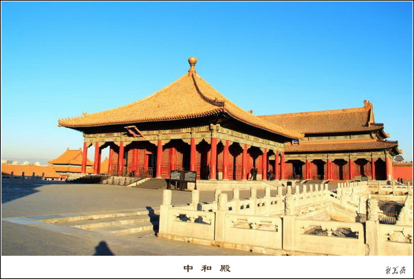 中和殿(明朝称华盖殿、中极殿)是故宫三大殿之一,位于太和殿后。中和殿高27米,平面呈正方形,面阔、进深各为3间,四面出廊,金砖铺地,建筑面积580㎡。黄琉璃瓦单檐四角攒尖顶,正中有鎏金宝顶。四脊顶端聚成尖状,上安铜胎鎏金球形的宝顶,建筑术语上叫四角攒尖式。中和殿是皇帝去太和殿举行大典前稍事休息和演习礼仪的地方。皇帝在去太和殿之前先在此稍作停留,接受内阁大臣和礼部官员行礼,然后进太和殿举行仪式。另外,皇帝祭祀天地和太庙之前,也要先在这里审阅一下写有祭文的“祝版”;在到中南海演耕前,也要在这里审视一下耕具。