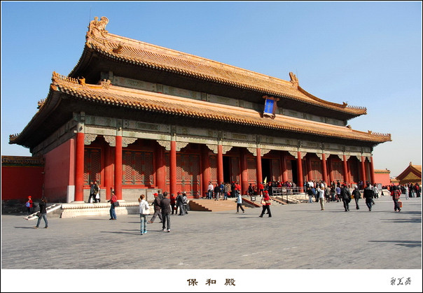 保和殿(明朝称谨身殿、建极殿)也是故宫三大殿之一,在中和殿后。保和殿高29米,平面呈长方形,面阔9间,进深5间,建筑面积1240㎡。黄琉璃瓦重檐歇山式屋顶。屋顶正中有一条正脊,前后各有2条垂脊,在各条垂脊下部再斜出一条岔脊,连同正脊、垂脊、岔脊共9条,建筑术语上叫歇山式。保和殿是每年除夕皇帝赐宴外藩王公的场所。保和殿也是科举考试举行殿试的地方。