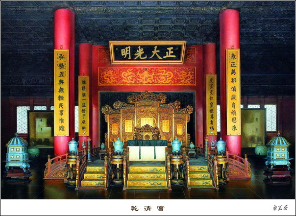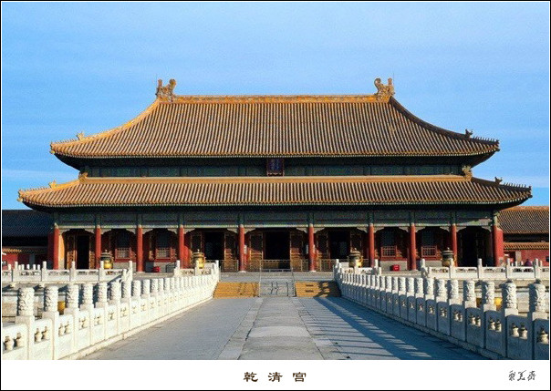 乾清宫在故宫内庭最前面。乾清宫是内廷正殿,高20米。重檐庑殿顶。殿的正中有宝座,内有“正大光明”匾。两头有暖阁。乾清宫是封建皇帝的寝宫。清康熙前此处为皇帝居住和处理政务之处。清雍正后皇帝移居养心殿,但仍在此批阅奏报,选派官吏和召见臣下。