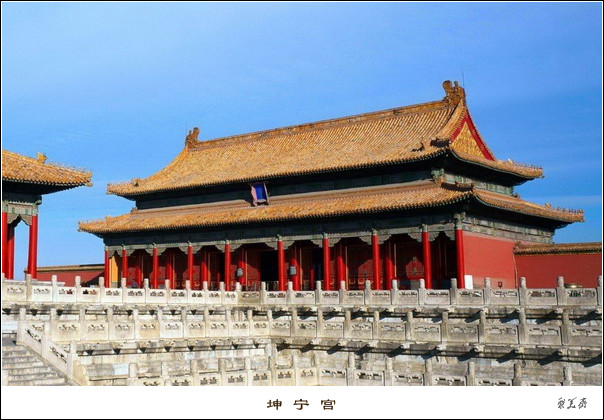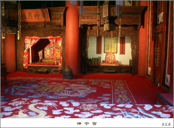 坤宁宫在故宫“内庭”最后面。重檐庑殿顶。坤宁宫是明朝及清朝雍正帝之前的皇后寝宫,两头有暖阁。清代改为祭神场所。雍正后,西暖阁为萨满的祭祀地。其中东暖阁为皇帝大婚的洞房,康熙、同治、光绪三帝,均在此举行婚礼。