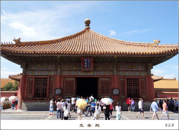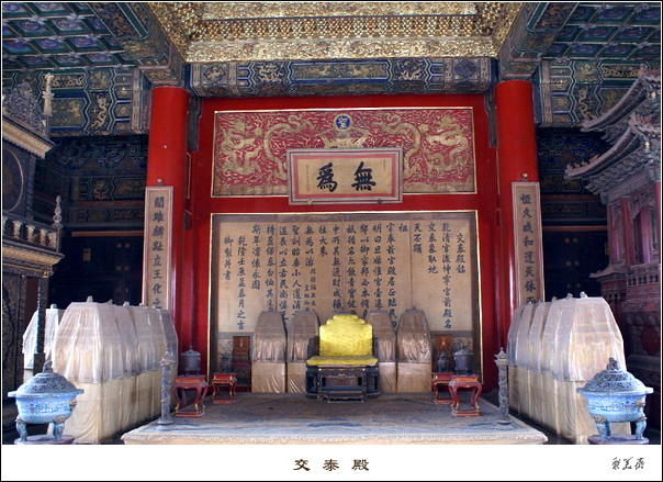 交泰殿在乾清宫和坤宁宫之间,含“天地交合、安康美满”之意。其建于明代,清嘉庆三年(公元1798年)重修,是座四角攒尖,镀金宝顶,龙凤纹饰的方形殿。明、清时,该殿是皇后生日举办寿庆活动的地方。清代皇后所谓亲蚕典礼,需至此检查祭典仪式的准备情况。清代的“宝玺”(印章)也收藏在这里。