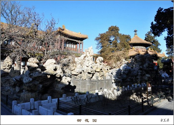 在坤宁宫北面的是御花园。御花园里有高耸的松柏、珍贵的花木、山石和亭阁。御花园原名宫后苑,占地11000多平方米,有建筑20余处。以钦安殿为中心,园林建筑采用主次相辅、左右对称的格局,布局紧凑、古典富丽。殿东北的堆秀山,为太湖石迭砌而成,上筑御景亭,名为万春亭和千秋亭的两座亭子,可以说是目前保存的古亭中最为华丽的。