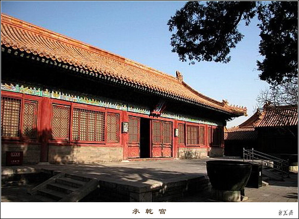 承乾宫--据说是顺治帝爱妃董小鄂的寝宫,董小鄂深受顺治宠爱,死后据说被追封为皇后,顺治也因此而出家避世。后来此宫成为养鱼养鸟之所。
