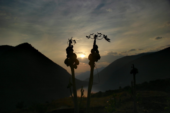 去湾碧有两条路,一条叫“走上线”,“走上线”是指从大姚县城出发经六苴到昙华再到桂花最后到湾碧。这条路从海拔1800公尺左右的县城金碧镇出发就要开始爬升直到翻越百草岭。百草岭可是全州最高峰,海拔3657米。车虽不从山巅过,但从山麓间,行走在那些挂在悬崖上弯弯拐拐的路,我很是发怵。驾驶员或其他坐车人倒是神情自若,说说笑笑。我捏车门扶手的右手简直烫得可以煎鱼。