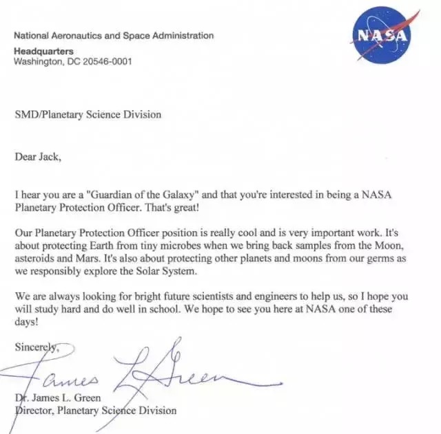 亲爱的Jack: 我听说你是“银河系守卫者”,想成为NASA的一名星球保卫官,这真是太好了! 我们这个星球保卫官的职位的确非常酷炫,而且也很重要。每次当宇航员从月球,小行星,火星上带回样品时,都很有可能携带一些细菌或病毒,而我们的工作,就是保护我们的地球不受这些细菌病毒的侵害。 我们的这个岗位,需要求职者get到各种技能,科学、外语、计算机、生物、工程、医学……所以我希望你能好好学习,在学校取得好成绩。希望未来能在NASA看到你!守护地球,就靠你啦!