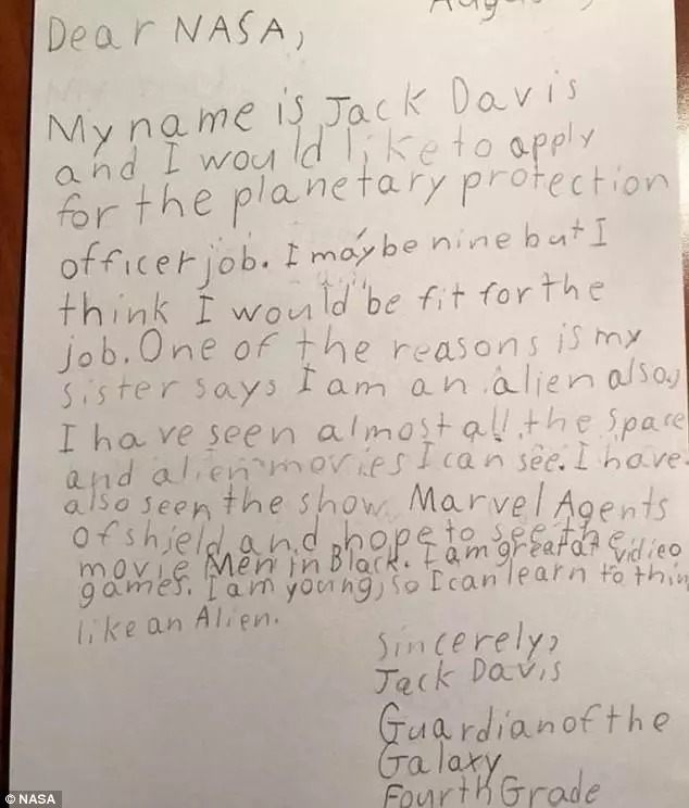 亲爱的航天局: 我叫Jack, 我想要申请你们“星球保卫官”的工作。虽然我只有九岁,但我觉得这份工作非我莫属哦!为啥呢?听我给你说: 1. 我姐姐常说我是外星人,而且我看了所有我能看到的外星人和太空电影哦。 2. 我还看了漫威的《神盾局特工》,还想看《黑衣人》!是不是跟你们工作很符合~~ 3. 我打游戏也很腻害哒。 4. 我很年轻,所以我可以学习像外星人一样去思考~~ “银河系守卫者” 四年级小学生 Jack David