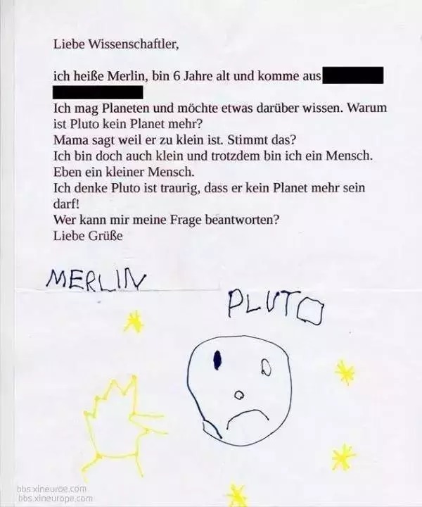 Jason在关心外星人的时候,一个来自德国的小男孩则替冥王星打抱不平。 大家还记得冥王星在2006年的时候,通过国际天文学联合会决议,被认为不再是太阳系九大行星之一么,这件事让德国的一个小男孩非常伤心,他给德国航天局写信,“你们为什么把冥王星开除了?是因为他太小了吗?可是我也很小啊,你们这样冥王星会难过的!” 当然,他也收到了回信,航天局的哥哥姐姐给他回信,解释冥王星的大小和轨道,怕他不懂,还安慰他,“我想冥王星不会难过的,因为他还是会继续转动的。”
