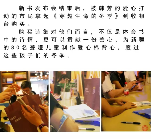 今天下午,工人书城举办了“爱心&诗情”相结合的新书发布会,作者是来自新疆的韩芳。已经著有小说集《我在天涯为你歌唱》、散文集《我在村头等你回来》的她,这一次带来了有声诗集——《穿越生命的冬季》。