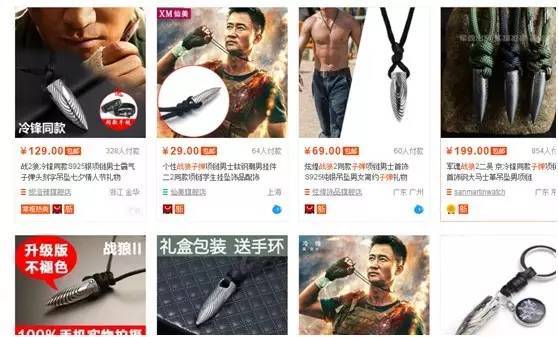 小金刚+折扇 每次票房高或收视率高的电影电视剧一出现,中国必会出爆款。再来看看冷锋戴的那款水波纹子弹吊坠,电影上映第二天就已经出版并开始生产了。 动图