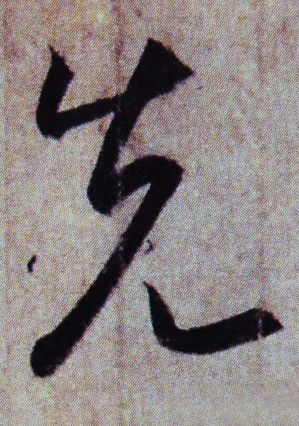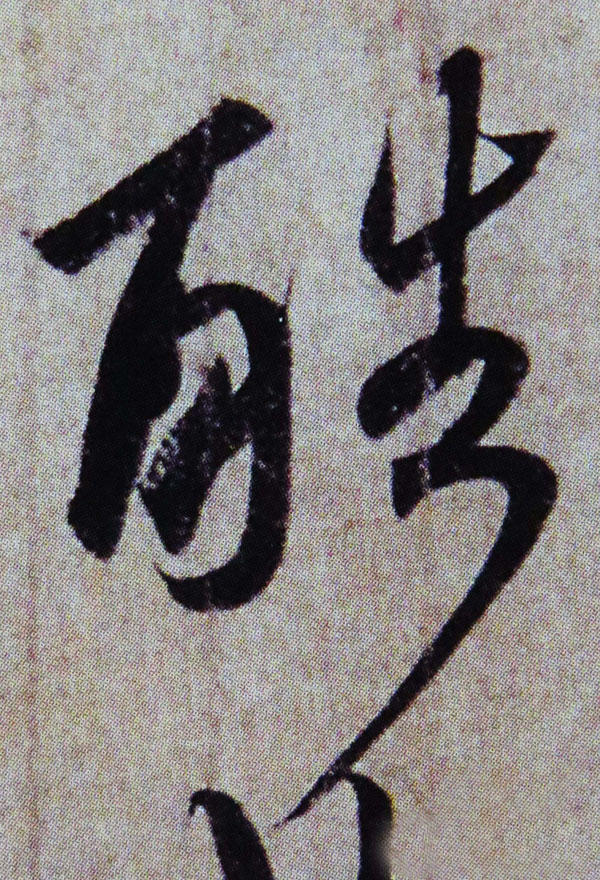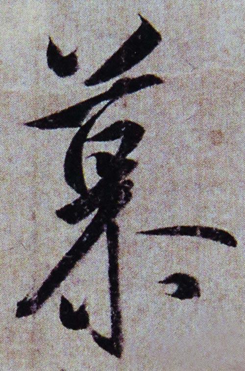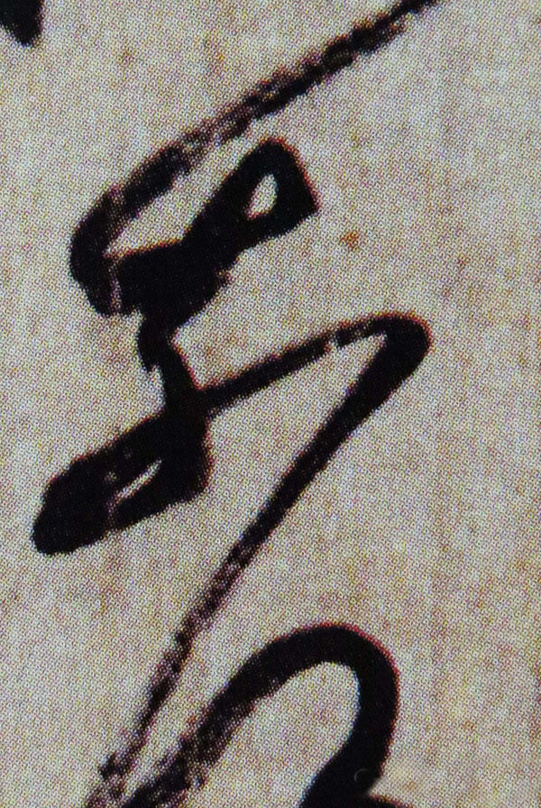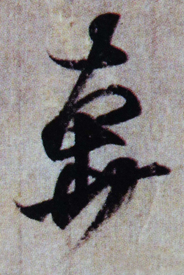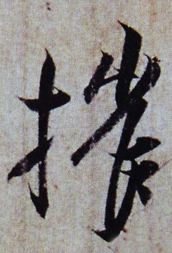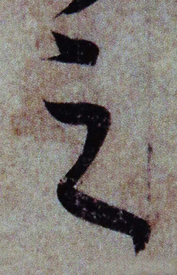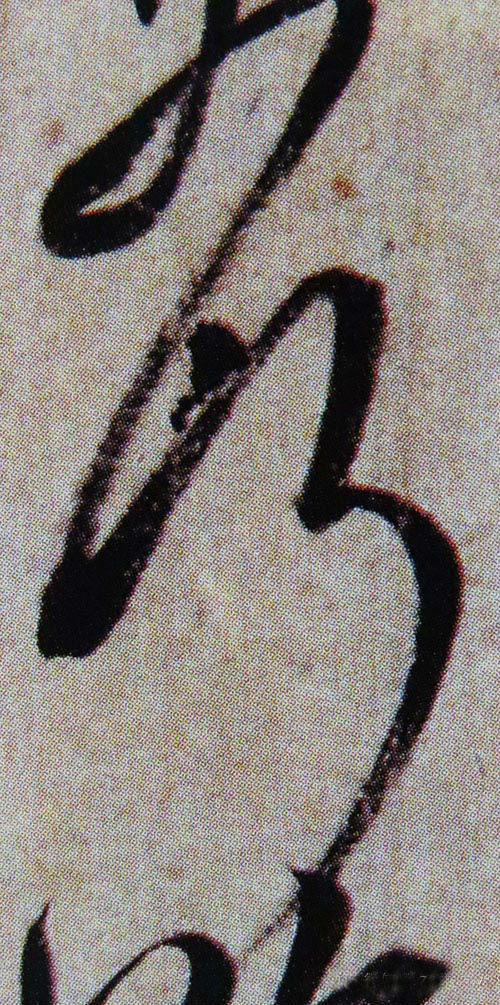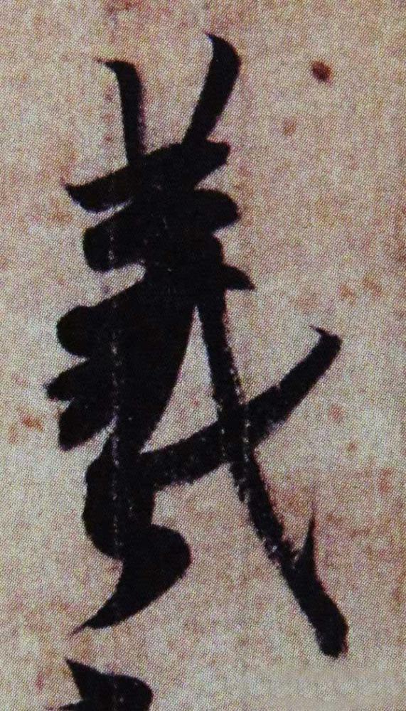 假使我们不把作品中的点画当作线,而是书作各种形状的块而来观察,便可以发现这些块面形状都比较复杂。块面的边线是一些复杂的曲线和折线的组合,曲线遒美流转,折线劲健挺拔,同时,点画具有强烈的雕塑感,墨色似乎有从点画边线往外溢出的趋势,沉著而饱满。这种丰富性、立体感都得之于笔毫锥面的频频变动。作品每一点画都像是飘扬在空中的绸带,它的不同侧面交迷著、扭结著,同时呈现在我们眼前;它仿佛不再是一根扁平的物体,它产生了体积。这一段的侧面暗示著另一段侧面占有的空间。这便是人们津津乐道的“晋人笔法”。它是绞转所产生的硕果。