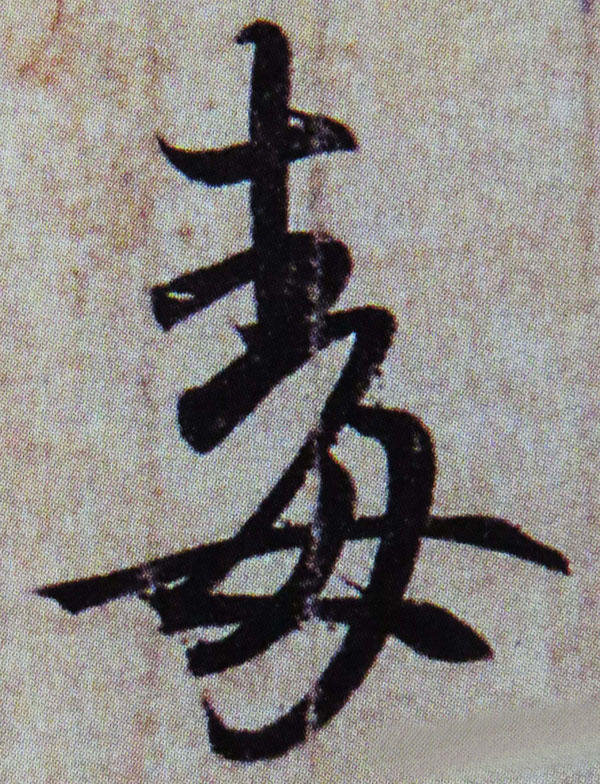 《丧乱帖》大部分行轴线都略向左侧倾斜,形成此帖构成的特殊面貌;首行第一字轴线脱离这一趋势,略向右平移,正好维持了整行轴线的稳定,但又无碍于轴线向下方流动的基调;二、四、五、七行轴线成为第一行主题的变奏;三、六行轴线趋于垂直方向,平衡了作品重心左移的不稳定感,这两行轴线与两侧轴线线型微妙的呼应、下部极为细心的吻接,使它们在作品中成为无形的支柱;第八行轴线也有类似作用,它第一字右倾的轴线与第六行首字右倾轴线一起,与其他各行轴线起端的左倾趋向对峙,也成为维系作品平衡的重要力量。