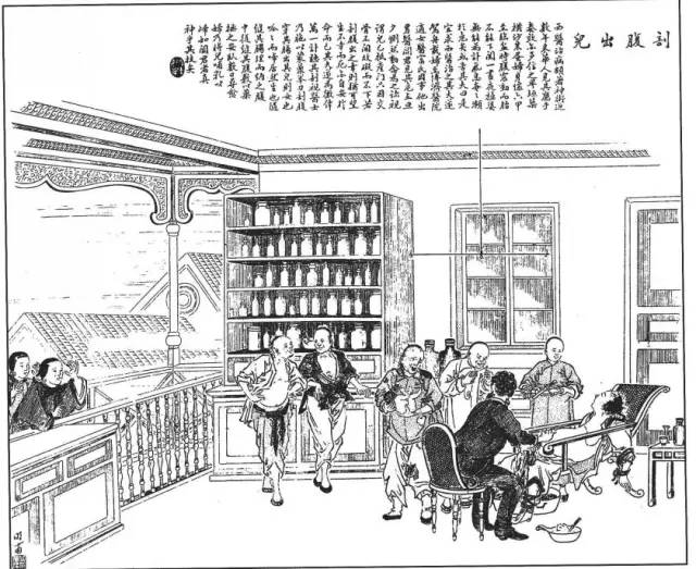 《点石斋画报》描绘的中国第一例现代剖腹产手术。广州博济医院收治了一位难产孕妇,此前,中国的产婆花费了一天时间也没有顺利生产。丈夫抱着试一试的心态来博济医院请洋人诊治。医生立刻采取剖腹产,最后顺利诞下一名女婴,母子平安。《点石斋画报》赞叹道“西医治病颇著神效,近数年来华人见其应手奏效,亦多信之”