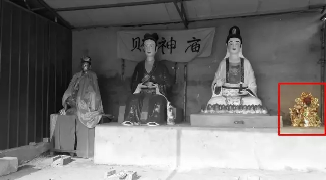 这是据史料记载,海内外唯一一尊女财神。就是因为她手上捧着金元宝,后面写着财神庙。