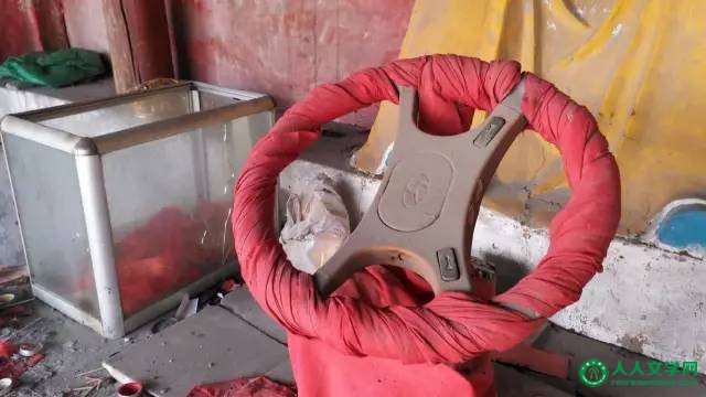 这是中殿的一个车神。这个车神手上没拿东西,但是它前面供了一个大巴车神:公交车的方向盘。