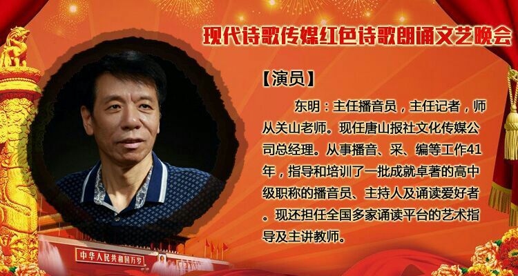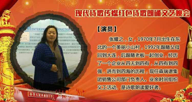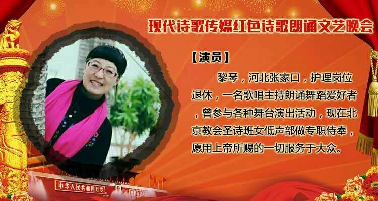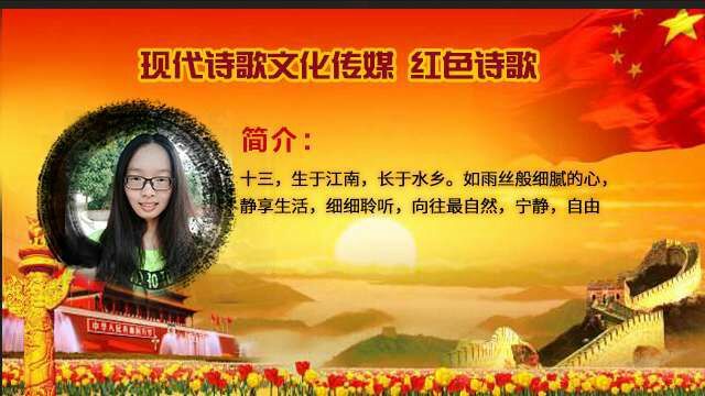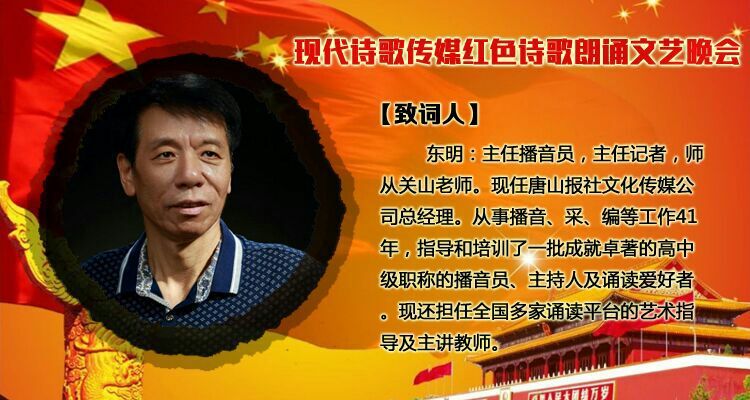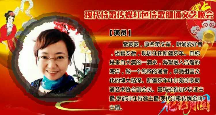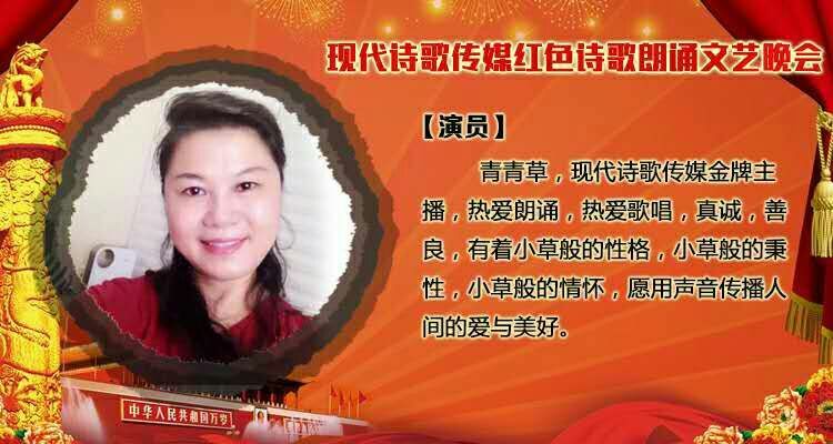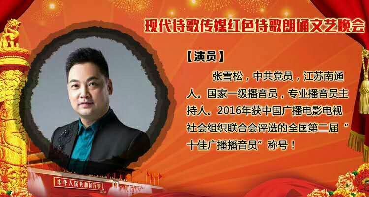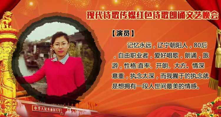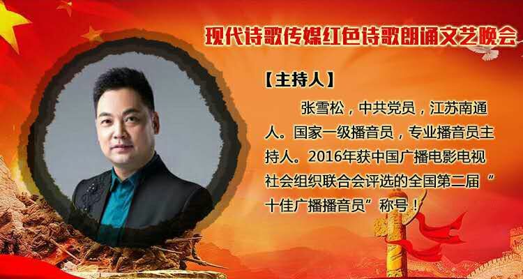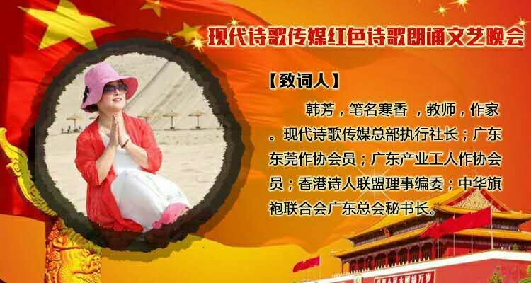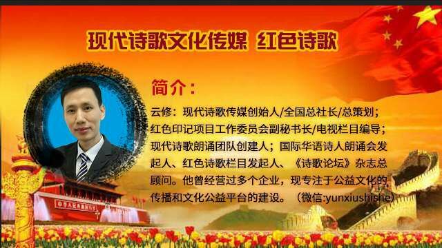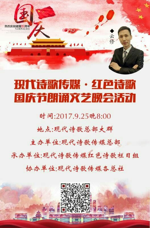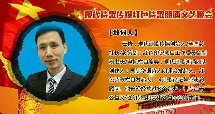为了喜迎国庆,现代诗歌传媒红色诗歌栏目义工团默默筹备了一场诗歌朗诵文艺晚会,晚会分为开篇结尾曲和四个篇章,在晚会前还邀请了现代诗歌传媒创始人云修先生和总部几位主要成员出席并致词!活动时间定在2017年9月25日晚,一场盛大的诗歌朗诵文艺晚会即将在现代诗歌传媒总部开演,期待现代诗歌传媒所有的家人们关注和欣赏!一、主持人简介:二、致词嘉宾简介:三、晚会正式开始:四、现代诗歌传媒红色诗歌栏目组委会成员介绍:    现代诗歌传媒简介:现代诗歌传媒从2015年创建以来,一直坚持诗歌文化公益路线,为广大的诗歌爱好者提供了一个公益性平台;到目前为止,现代诗歌传媒有几百名文化义工,同时,全国各省设立的分机构也在健康发展中,初步统计,已加盟在现代诗歌传媒旗下的人数达1万左右;现代诗歌传媒根据广大爱好者的意见和需求,已全面启动了线上线下相关旅游文化活动和基础建设,如:由现代诗歌传媒发起的《国际华语诗人朗诵会》新疆霍城第七届国际薰衣草旅游节的大型公益活动,得到了社会好评和当地政府部门的赞誉……现代诗歌传媒第一本有声诗集的出版,现代诗歌传媒会刊《诗歌论坛》杂志已问世,现代诗歌传媒网站建设,红色诗歌栏目、少儿栏目、旅游文化栏目建设等,2017年9月3日,现代诗歌传媒与中国诗诗歌春晚签订战略协议后有责任和义务招募中国诗歌春晚的全国各地分会场;9月9日,现代诗歌传媒总部基地和培训基地在广东东莞挂牌;这些都与现代诗歌传媒家人们的共同努力分不开,感恩有你们一路诗意同行……