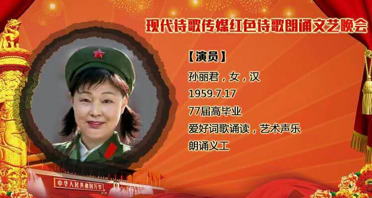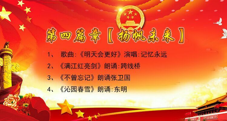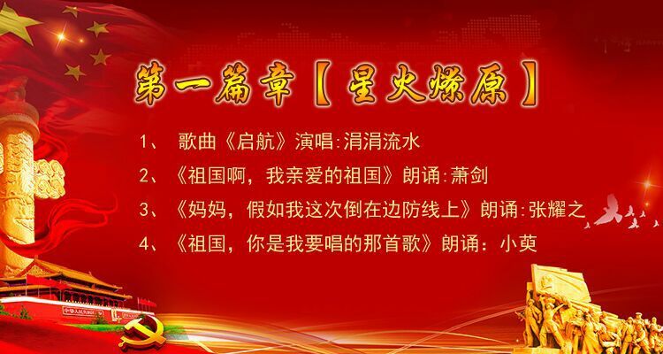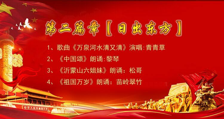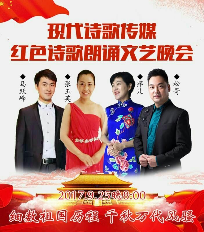 (人人文学网讯-梦飞翔): 金秋十月庆国庆,花好月圆度中秋。神州大地皆欢腾,祝福祖国万年盛。2O17年9月25曰晚八点,由现代诗歌传媒总部发起,现代诗歌传媒红色栏目组承办,全国各总社协办,一场盛大的国庆朗诵文艺晚会在总部群如期举行,晚会由张玉英,张雪松,马跃峰,萍儿四位主持人联袂主持。晚会在 红色诗歌栏目组精心的编排中,伴随奏响的国歌在神圣庄严的升国旗仪式下徐徐拉开帷幕。现代诗歌传媒创始人云修致开幕词,他向所有红色诗歌,红色印记的工作人员及所有参会的人员表示感谢。执行社长韩芳,主播团长长坤,红色栏目军人代表箫剑,语言指导院院长师东明等人也与会致词。东明老师深情诗朗诵将一首大气豪迈的诗歌《祝福的日子》送给伟大的祖国《今天,是你的生日》艺术团团长孙丽君高歌一曲唱响全场,晚会正式开始。整个晚会分四个篇章《星火燎原》《日出东方》《花好月圆》《扬帆未来》依次展开,每个篇章四人参演,分别带来歌曲,诗朗诵等节目,节目有序热烈地进行。涓涓流水,箫剑,张耀之,小萸四人将第一篇章《星火燎原》,点燃了全场的热情,祖国,是我们心中唱响的那首歌,为你启航。青青草,黎琴,松哥,苗岭翠竹在《日出东方》篇章带来的《万泉河水清又清》《祖国颂》等节目,优美的歌声,激情朗诵将晚会推向高潮,掌声迭起。《花好月圆》贺金秋,《惜别的海岸》诉衷肠,柳丽芝,雨寒、紫菱菱、雨娘表演的《中秋赏月》《明月几时有》等节目,走心的文字,深情的演译将全场感受到浓浓的中秋明月情。晚会进行到最后篇章《扬帆未来》,表演者跨线桥、张卫国、东明将《沁园春雪》《满江红亮剑》《不曾忘记》诗朗诵再次精彩演译,让我们期待《明天会更好》,让五星红旗高高飘扬,让雄威的歌声响彻四方,晚会历经三个小时,最后在多美丽演唱的《五星红旗》下圆满结束。
