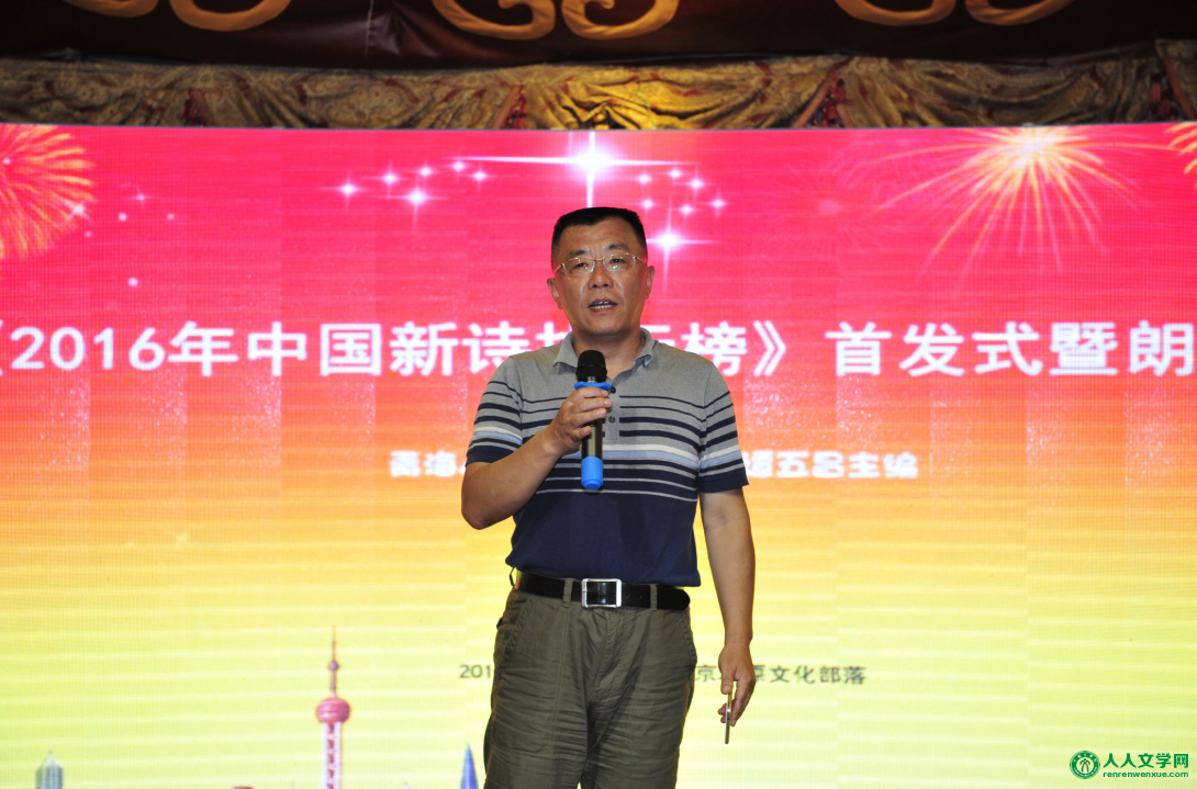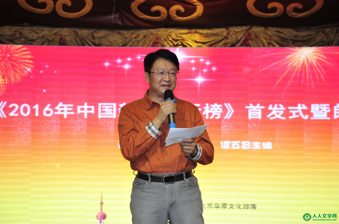 ![]() 陆健在首发式上发言 ![]() 树才在首发式上发言 ![]() 杨志学在首发式上发言 ![]() 洪烛在首发式上发言 ![]() 杨海蒂代读祁人的贺信 ![]() 冰峰在主持诗歌朗诵会上半场 ![]() 李军在朗诵吉狄马加的作品 ![]() 汪剑钊在朗诵自己的作品 ![]() 山东诗人王永江在朗诵会上演唱歌曲 ![]() 安琪在主持诗歌朗诵会下半场 ![]() 梅尔在朗诵自己的作品 ![]() 与会部分嘉宾合影留念 人人文学网讯:2017年9月30日下午,由北京师范大学中国当代新诗研究中心主任、著名诗歌评论家谭五昌主编、由青海人民出版社出版的《2016年中国新诗排行榜》首发式暨朗诵会在北京草原文化部落隆重举行。陆健、树才、汪剑钊、潇潇、谭五昌、祁人、杨志学、梅尔 、刘以林、洪烛、冰峰、安琪、花语、杨北城、杨海蒂、冯章、季冉、楚天舒 、陈红、王威、王爱红、王博生、超侠、张成德、王永江、王霁、杨罡、陈相国、妥彦鑫、赵宏娟、马志刚、杨超、苏明、谢长安、曹谁、胡勇、赵天饴、贾玉东、王月、李贵成、刘井彬、李军等诗人、评论家、朗诵家,以及北京师范大学等首都高校的学子近百人出席了本次活动。 《2016年中国新诗排行榜》首发式暨朗诵会由青海人民出版社、国际汉语诗歌协会主办,由作家网、中诗网、人人文学网协办,著名女诗人潇潇、作家网总编冰峰、著名女诗人安琪联合主持。谭五昌主编在开场白中,感谢各位诗人朋友以及诗爱者在国庆与中秋节前夕,赶来参加一年一度的中国新诗排行榜发布会,并引用著名翻译家、诗人高兴与著名艺术家、诗人刘以林的话语,称许多诗人、诗爱者、朗诵艺术家把一年一度的中国新诗排行榜发布会当成一个盛大的精神节日,而这是他自己连续七年主编《中国新诗排行榜》的巨大动力。谭五昌主编对自己的诗歌编选工作多年来获得海内外广大诗人朋友们的大力支持深表谢意,他特别指出与强调,21世纪是东方文化、中国文化复兴的世纪,诗歌与诗人将在新世纪中华文化复兴过程中扮演着极为光荣的角色,他为自己有机会为海内外这么多有情怀、有理想的诗人做服务性工作感到幸福,他真诚地祝愿广大诗人们在美好的秋天季节里获得创作上的丰收。 在由潇潇主持的《2016年中国新诗排行榜》首发式上,陆健、树才、杨志学、汪剑钊、洪烛等著名诗人、翻译家、评论家,先后进行了热情洋溢的发言,大家对谭五昌这位在海内外诗坛具有广泛影响力的诗歌评论家、编选家长期以来对中国当代诗歌作出的重大贡献表示充分赞赏与高度认可,并对《2016年中国新诗排行榜》一书给予了普遍好评,一致认为该选本极具审美性、包容性、开放性,视野开阔,海纳百川,独具特色,全面呈现了2016年度诗歌创作的思想艺术风貌。 进入朗诵会阶段,李军、若丹、侯志刚、隋源、柏荷、袁翔、韩梓洲、杜雨桐、郭延芬、郭春华、刘慧芬、侯雷、柏霖、高颖、石慧珍等朗诵者陆续上台朗诵《2016年中国新诗排行榜》中的部分入选诗作,朗诵者们感情投入且不同风格的朗诵,让现场听众充分感受到了朗诵艺术的魅力,领略到了诗歌作品的声音之美。 诗歌朗诵会分为上、下两场,分别由冰峰与安琪主持。朗诵者们先后朗诵了《记小学同学聚会》(作者:食指)、《寻找费德里科·加西亚·洛尔加》(作者:吉狄马加)、《抉择》(作者:叶延滨)、《在江宁》(作者:陆健)、《登江心屿》(作者:祁人)、《戈壁》(作者:汪剑钊)、《时光倒流》(作者:洪烛)、《我是谁》(作者:潇潇)、《文人之死》(作者:树才)、《泄露》 (作者:李少君)、《布拉格,圣维特大教堂》(作者:杨北城)、《菊花》(作者:柏常青)、《在龙门石窟》(作者:杨志学)、《祖国之夜》(作者:姜念光)、《院中大杏树》(作者:刘以林)、《存在与虚无》(作者:周庆荣)、《头顶的声音》(作者:吕约)、《老虎》(作者:石厉)、《泛爱论》(作者:夏花)、《词语》(作者:高兴)、《大索庄的十字街口》(作者:商泽军)、《一瓶白酒》(作者:冰峰)、《轩辕湖畔》(作者:杨海蒂)、《棉桃》(作者:胡勇)、《长夜》(作者:四月)、《参观泾县红星宣纸厂》(作者:王爱红)、《夜宿岭下村》(作者:周占林)、《刀记》(作者:徐南鹏)、《宇宙书》(作者:雁西)、《母亲走到哪里就照到哪里》(作者:舒喆)、《死与生》(梅尔)。朗诵会半场期间穿插了一个节目表演,来自山东济南的诗人王永江为观众献上了精彩的歌曲演唱《芦花美,荻花美》。他的唱腔婉转悠扬、情感细腻,在场观众都屏住呼吸,静静聆听,表演结束后听众给予了他热情的掌声。 值得一提的是,除了十多位朗诵者较为专业的朗诵外,汪剑钊、潇潇、树才、杨北城、梅尔这五位知名诗人还亲自上台朗诵了自己的作品,让现场听众聆听到诗人的原声朗诵,体验到一种独特的韵味,为朗诵会带来了另一道动人的风景。 《2016年中国新诗排行榜》首发式暨朗诵会持续了两个半小时才告结束,听众一直在安静聆听诗歌的声音,享受一场审美精神的盛宴。谭五昌主编在最后简短的总结性发言中,首先感谢潇潇、冰峰、安琪的认真主持,并衷心感谢到场的诗人朋友们与朗诵界的朋友们对此次诗歌发布会的鼎力支持!他最后真诚希望广大诗人、诗歌爱好者、艺术家继续支持他所从事的诗歌工作。活动结束后,与会的诗人嘉宾与听众们普遍认为《2016年中国新诗排行榜》首发式暨朗诵会圆满成功,并期