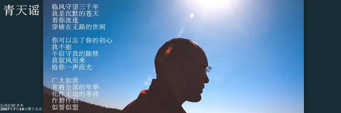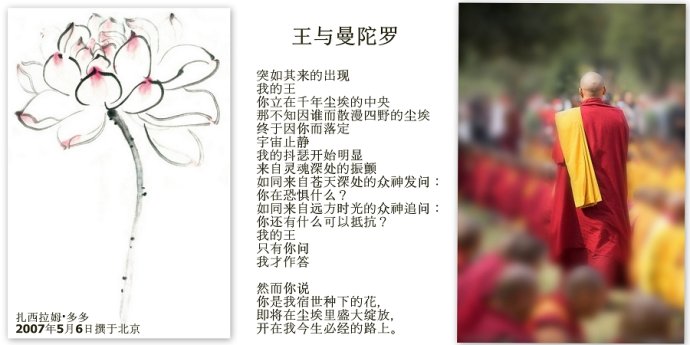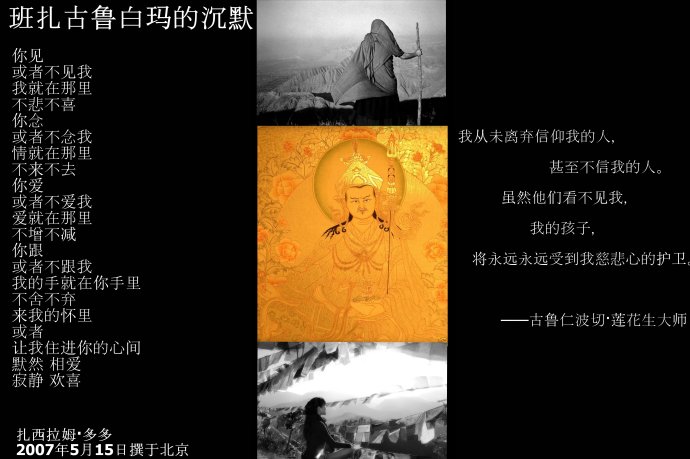 多多后记: 曾经在网络上被反复转载的诗歌《班扎古鲁白玛的沉默》(标题后来更被篡改为《见与不见》),被很多人误传为是六世达赖喇嘛仓央嘉措的作品。其实这首诗出自多多从零七年五月开始写的《疑似风月》集的中集,在《沉默》之前还有《唱》和《说》,它们是同一个系列的。“班扎古鲁白玛”其实是梵文的音译,班扎,就是Vadjra,是“金刚”的意思;古鲁,就是:Guru,是“上师”;白玛,就是pema,是“莲花”的意思。“班扎古鲁白玛”:金刚上师白莲花,也就是莲花生大师(第一个将佛法传入西藏的人,被认为是第二佛陀)。而莲花生大师的心咒就是:“嗡阿吽班扎古鲁白玛悉地吽”,在起名字的时候,我就是从这个心咒中取的。这一首《班扎古鲁白玛的沉默》的灵感,其实是来自于古鲁仁波切·莲花生大师非常著名的一句话:“我从未离弃信仰我的人,或甚至不信我的人,虽然他们看不见我,我的孩子们,将会永远永远受到我慈悲心的护卫”,多多想要通过这首诗表达的是上师对弟子不离不弃的关爱,真的跟爱情、跟风月没有什么关系。