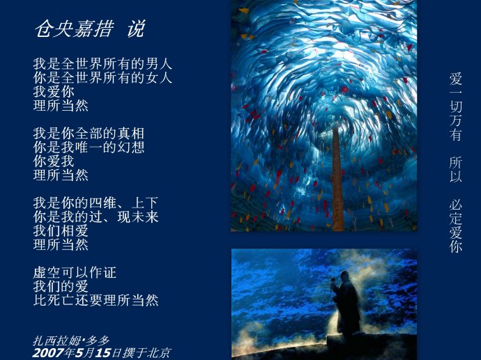 天要宠你我的爱太深太重,所以我无法爱你。我只能爱包括你在内的一切万有,你介意么? ——扎西拉姆多多 亲爱的,你知不知道,有一股强大,要通过我,到达你。 它来自浩瀚的岁月和广阔的寰宇,它来自最深沉,也来自最高极,它来自最古老,也来自最新奇。它选中了我的同时,也选中了你。 我必须允许啊,允许它流经我,允许它激起我里面的一些沉疴、一些浑浊。允许它重重地压向我,直到我不再逃避,直到我全然地展开我自己。了达,通透,穿心如隙。 我必须跟随啊,跟随它寻找你,寻找它最终需要达到的目的地。跟随它在恒河沙数世界游历,一时间,你哪儿都不在,一时间,全都是你。只有它知道,只有它有辨认的权力。 它是如此的强大,以至于,即便你不愿意接受我,它仍然会通过无量的通道、每一个别人,进入你、充遍你。这,我就放心了。 它是如此的强大,以至于,即便你不愿意接受我,它仍然会将我虹化,流溢在天际,我将早你一步到达明空之境。请你,也放心吧。 亲爱的,你准备好了吗?准备好,接受这强大的爱,它并不来自我,是天要宠你。 2009年12月1日凌晨 扎西拉姆·多多 写于北京 一下笔的时候,我以为我要写爱情,收笔的时候,才知道不是。