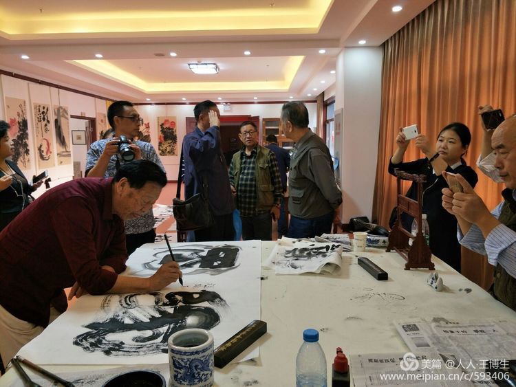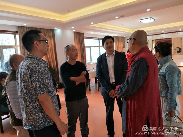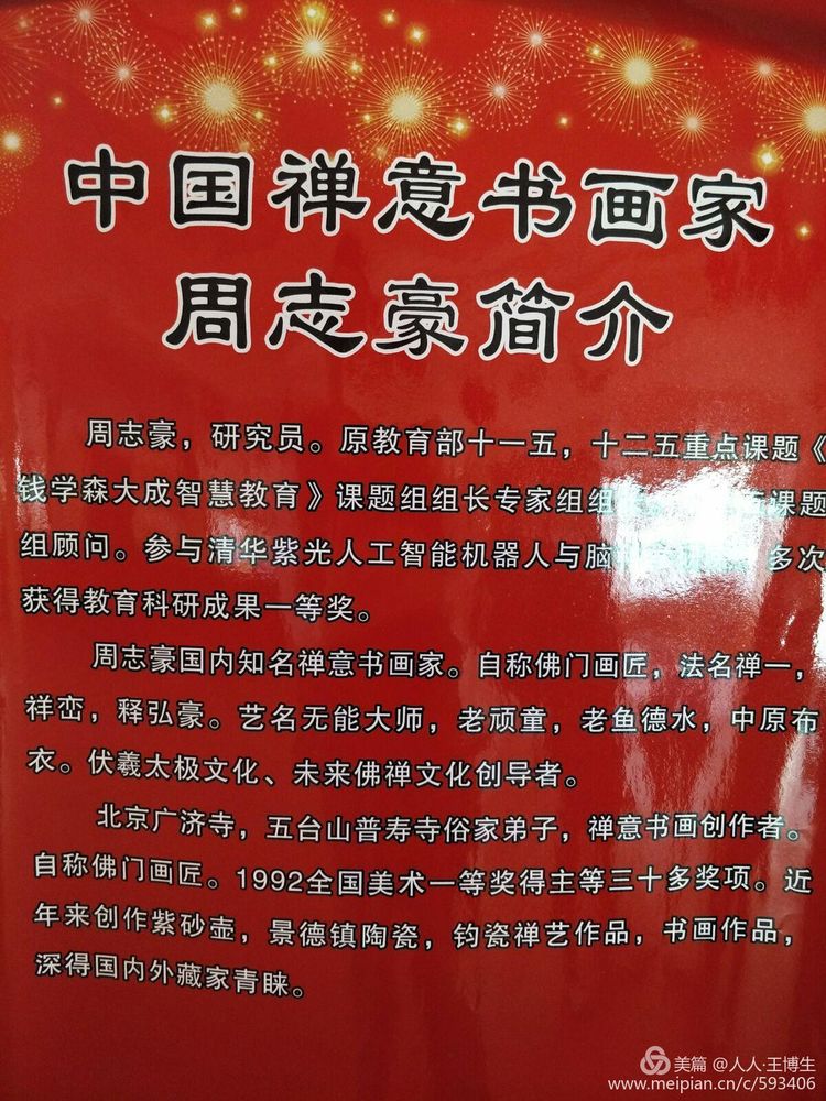 人人书画网简讯:2017年10月3日,中国禅意画家周志豪书画展在北京马连道茶叶街开幕。来自书画界的师朋好友近百人出席开幕。书画展到重阳节闭幕。欢迎光临参观指导。第三区商业街对面。  周自豪,原名:周志豪,中国当代著名禅意画家,笔名然木水,禅一居士。斋号荷花草堂,自然堂,羡鱼斋。中国太极鱼文化创始人,中华国礼艺术家协会副会长,中华国礼书画院院长,北京(清华大学)紫光优蓝教育研究院院长,中国周恩来研究会副秘书长·艺术家专业委员会常务理事,北京中广达书画院常务副院长,世界华人联合会北京名家世华书画院签约画家,CCTV文化中国·艺术家沙龙理事 签约画家,北京远山诗院首席签约画家,99字画网签约画家。