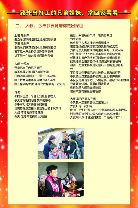 ~ 上坡急刹车 要当心 浓荫掩盖的土坯房炊烟袅袅 下坡 急刹车 要当心 月落乌啼的小池塘微澜轻漾 看不见一座小桥如虹卧波的美好 找不到一个站台传递问候与亲情 ~ 首节点明了大叔生存环境的恶劣,弯弯曲曲的山路,让大叔与世隔绝!上坡急刹,下坡急刹,一次接一次的急刹,说明车子在悬崖峭壁上蠕动着,一不留神,命就没了!而扑入眼帘的座座土坯房说明居住条件极差! ~ 大叔 一见你 我彻底忘了自已的疯狂 敲不成莲花落 唱不响阳关调 日月四季转换你一千零一个的故亊 除了折磨劳累还是孤凄的痛不欲生 除了相戚的卑微 还是代代相袭的一贫如洗…… ~ 第二节,诗人把自己的生活与大叔作了比较,结果被巨大的悬殊给深深的震撼了!如果说自己的生活多姿多彩,那么大叔的日子就只有黑和白! ~ 传说 你的前世是一个温和知礼的债权人 今天你呜咽的泪花 失声的感动 似千军万马奔腾在我的胸膛 灵魂的禅念连接太湖到乐山的半尺鸿沟 大叔 不要疑恐不要在意 今天 我要背着你走岀深山! ~ 第三节,山里的大叔,他的质朴与善良将诗人深深地感动了!诗人感觉自己的付出微不足道,而大叔一辈子也忘不了!大叔虽然贫困卑微,但他身上却闪耀着人性的光辉!因此,诗人不忍大叔再搁这深山老林遭罪!她要背大叔从这深山里走出去! ~ 前世、我曾经有欠你一笔债的罪过 今生为你—— 该应留下太多太多的自责和愧疚 该应让你的悲哀伤痛焚烧我刻骨的无奈 为我无法无能替代你的生老病死、天灾人祸 我甘愿是一只上帝的羔羊独自走向修罗场 如果披上黄色的法衣可以借来仙鹤的双翅 如果摇响全世界的风铃 弥撒我所有的祈祷 可引一方净土扎根这闭塞几千里的荒山野岭 我—— 不仅要让这里褐色的山脉换上五彩的芬芳 不仅要让这里叠叠新楼青云直上书声朗朗 不仅仅是要有车站、八角凉亭、弯弯的九曲桥啊 我还要你红薯,青草的原汁原味 也有化梦为蝶的激情迷荡 也有玫瑰花郁金香的祝愿 ~ 第四节,诗人要竭力消除大叔的疑虑,之所以要背大叔走出深山,这是自觉自愿的行为!当然,这绝非是诗人一时冲动,而是她高尚情操的外化于形!诗人把这看成是还债,忓悔,报恩!看成是履行自己的义务与责任!诗人愿意牺牲个人的幸福,只要能改变大叔的命运! ~ 大叔 真的不要太在意 今天我一定要背着你走岀深山 ! 大叔!走!我们走…… (附言:我们一起去找一个美国的总统叫奥巴马 讨回他们欠我们中国人的近11000亿美元! 大叔啊大叔 你说我们该去!?还是不去?!) ~ 第五节,诗人化心动为行动:大叔,走,我们走,我背你走出这荒山野岭,背你去沐浴改革的春风! 而附言,更是发人深省,在这大山窝里苦苦挣扎的,绝不止大叔你一人,我们该怎么办呢?!