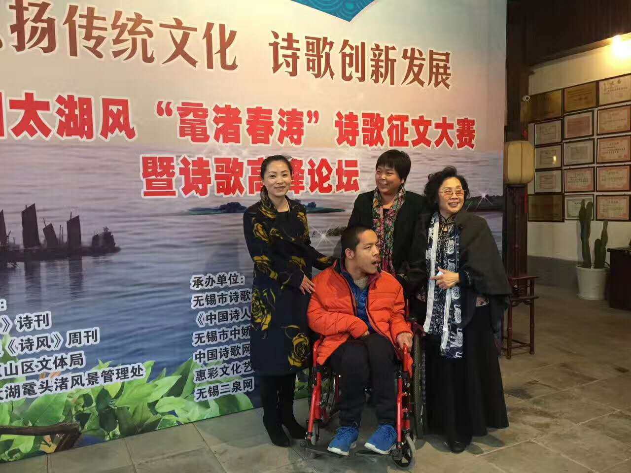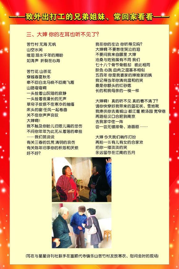 三、大婶你的左耳也听不见了 ~ 苦竹村无海 无帆 山空水闲 唯泪 溺水千年的期盼 如涛声 折裂在心海 ~ 第一节,诗人开门见山,指出大婶居住的苦竹村,山空水闲,无海无帆怎比那烟雨江南,但是这里却又不缺涛声,为何?涛声来自哭瞎的双眼! ~ 苦竹花 山茶花 穿越春夏秋冬 牵不回白龙马唤不回南飞的雁 山路弯弯啊 一头拴着山灰暗的寂静 一头拴着夜漫长的无声 草帘子按捺不住寒冷的抽搐 床头的窗 任风一起卷曲 大婶啊! 我不触及你盼儿归思儿痛的悲伤 不问你年年为此无从着落的牵挂 ——我们就说说 有关三春的饥荒 清明的哀伤 有关陈年旧事你的积怨和厌烦 ~ 第二节,把长镜头进一步推进:弯弯的山路啊/一头拴着山灰暗的寂静/一头拴着夜漫长的无声/草帘子按捺不住寒冷的抽搐 /床头的窗 任风一起卷曲//而大婶居住的房子,其实,早已出现在杜甫笔下,在这说话的当儿,也许屋顶上的茅草又被秋风掀掉一层!南方的雁不能唤回,说明大婶的儿子在外谋生,长年不归,抑或下落不明,这成了大婶一块最大的心病!诗人不忍触碰,那就随便聊一聊吧!只要大婶你能够释放一下沉闷的心情! ~ 我在你的左边 你听得见吗? 大婶啊 不要憋住哭泣的泪 不要问我来自哪里 大婶 沧桑与姓别虽有不同 我们 七十八个骨节骨骼却 彼此相同 肤色 心跳 血肉之温基本相似 五百年 你是我婆家的婶 娘家的姨 我记得当年你清纯温和的笑 最是你额头的红砂痣 长的和我母亲的一模一样 ~ 第三节,大婶的右耳何时失聪,诗人无从考证,但令诗人震惊的是,大婶的左耳现在居然也听不见了! 她以后怎么生活啊,我想此时的诗人内心一定是五味杂陈。 而实实在在的爱心捐赠,让大婶老泪纵横,对大婶而言,诗人一行,不似亲人却胜似亲人! 大婶啊,五百年 你是我婆家的婶 娘家的姨!诗人这滚烫的话语也让人不能不为之动容! ~ 大婶啊!真的听不见 真的看不清了? 请你快穿上我带来的蓝花袄、雪地靴 我搀你去青城山 都江堰 赖汤圆 宽窄巷 再路经汉口、合肥到南京 去我家中住一阵 尝一尝无锡排骨、油面筋…… ~ 第四节,诗人面对耳聋眼花的大婶,真希望她穿上崭新的服装,高高兴兴像过年一样。并随诗人一道见识一下外面世界的精彩,车票吃住诗人可以包了。若是可能,大婶家乡的青山绿水,要逐一逛逛,诗人家乡的特色小吃,也要一一品尝! ~ 大婶 今天我们稍作打扮 再拍一张有儿有女的合家欢 把你一缕淡淡的笑 永远留存在江南的五月 ~ 第五节,眼看分手的时间就要到了,大婶,将来我想你了怎么办?那就让我们合个影吧,虽然你的儿子杳无音讯,但我们都是你的儿女!诗人希望用这张全家福,留住一段最难忘的时光! 只要人人都献出一点爱,世界将变成美好的人间!最后,我想把上善若水的一首诗送给爱心大使——我们尊敬的梁溪安静老师! 《有一种爱……》 ~ 有一种爱 为需要者付出 不计报偿 ~! 有一种爱 把自己的所有 与他人分享 ~ 这种爱 用真情的力量 让黑暗中摸索的人 看到期翼的光 ~ 这种爱 四季绽放 那平等的善良 为温暖插上翅膀 ~ 这种爱 自由翱翔 用平凡的举动 为生命增添希望 ~ 这种爱 心之所向 唤醒更多感恩 让世界更加晴朗