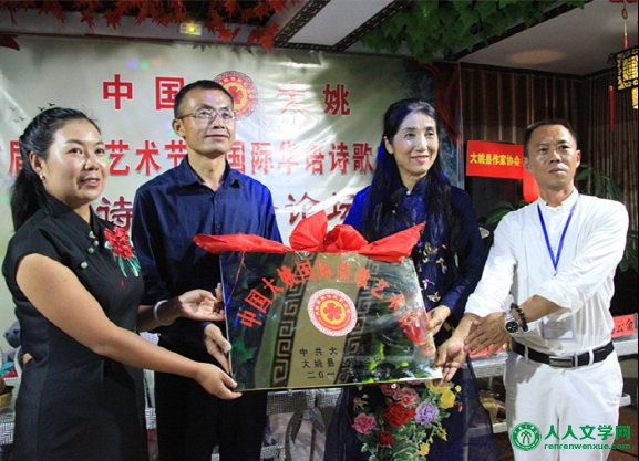 云南大姚首届诗歌艺术节暨国际华语诗歌艺术节隆重落幕 人人文学网讯:金色的秋天,大地丰收,瓜果飘香。一年一度的大姚孔子文化节,如期落幕。在几十个项目中,今年增加了一项崭新的内容,引入国际文化交流项目,由大姚县委、县人民政府和新加坡国际华语诗歌艺术节联合举办首届大姚诗歌艺术节暨国际华语诗歌艺术节。 国际华语诗歌艺术节是海外华人、华侨在新加坡发起成立的世界范围内首个华语国际诗歌艺术节,是合法的商业注册品牌及文化企业,其宗旨是在全全球范围内倡导和弘扬华语诗歌文化与艺术,为世界的和平美好做出贡献。 ![]() 新闻发布会现场