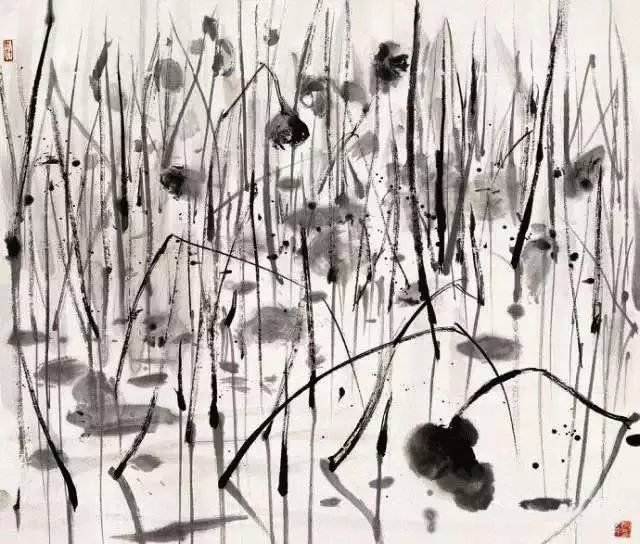 面对满池的残荷,吴冠中总忍不住心中的惊喜,他说:“荷塘中大块小块叶片之交错,曲线直线穿插之繁杂,连倒影也已被保卫进叶丛中,难分水上水下,似乎我只是叶底的昆虫,迷途于花叶的迷宫。”