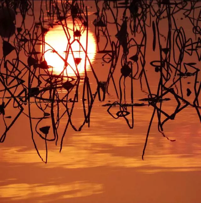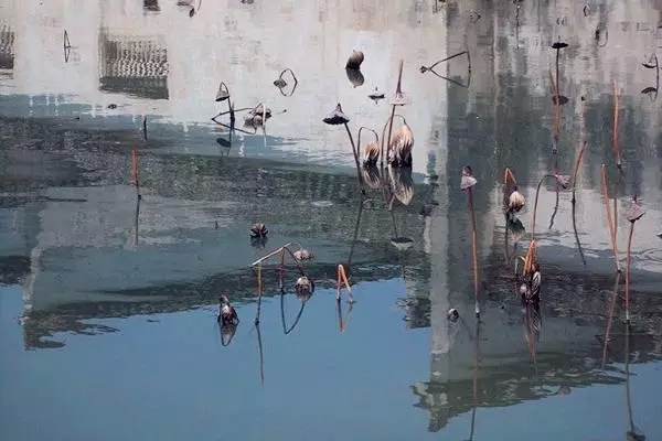 只看那瘦的枯枝,黄的败叶,重重叠叠,似是孩童随意挥就的涂鸦,线条交汇,点面交杂,影影绰绰,偏又看不真切,只知颜色浓厚的是残荷,颜色淡漠的是倒影,随便拍下一帧都具备水墨的写意。