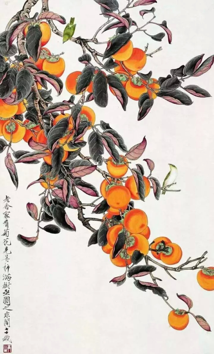 柿还有吉祥的寓意,柿柿如意、柿柿安顺。唐人段成式的《酉阳杂俎》里有载,柿有七绝:"一多寿,二多阴,三无鸟巢,四无虫蠹,五霜叶可玩,六嘉实,七落叶肥滑,可以临书。"
