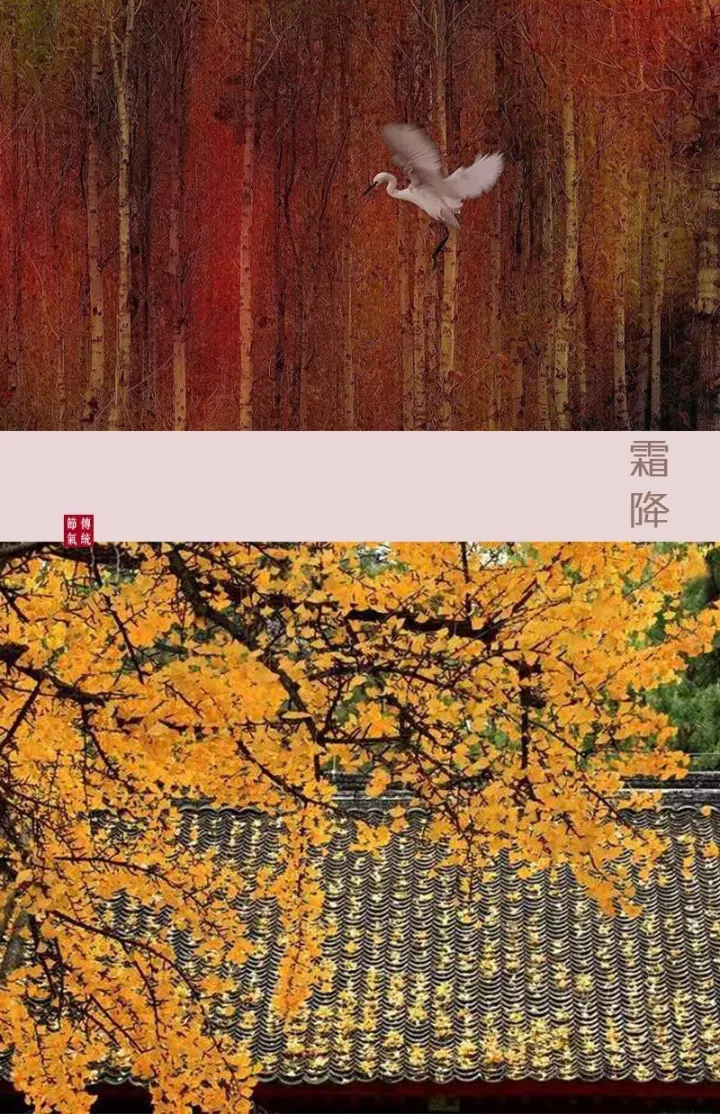 诗经里的“白露为霜”指得正是这个时节。如果说露是美好纯净之意,但霜就有点寒冷肃杀之意了。李时珍说:阴盛则露凝为霜,霜能杀物而露能滋物,性随时异也。