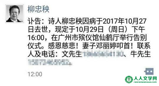 10月28日中午,诗人柳忠秧的朋友圈发出一条讣告:“诗人柳忠秧因病于2017年10月27日去世,现定于10月29日(周日)下午16:00,在广州市殡仪馆仙鹤厅举行告别仪式。感恩慈悲!妻子邓丽婷叩首!”