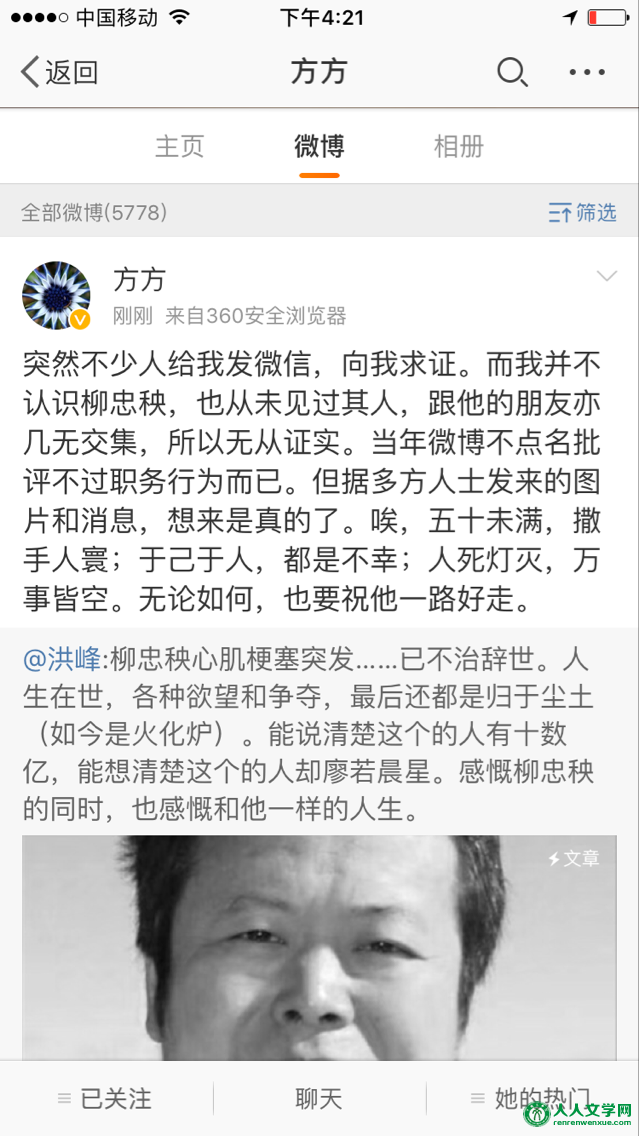 ▲方方质疑柳忠秧资料图 早在2014年,湖北省作协主席、作家方方发表微博批评柳忠秧为鲁迅文学奖“四处活动”,引发舆论热议。 柳忠秧去世的消息被爆出后,方方在自己的微博中对此事作出回复:“突然不少人给我发微信,向我求证。而我并不认识柳忠秧,也从未见过其人,跟他的朋友亦几无交集,所以无从证实。当年微博不点名批评不过职务行为而已。但据多方人士发来的图片和消息,想来是真的了。唉,五十未满,撒手人寰;于己于人,都是不幸;人死灯灭,万事皆空。无论如何,也要祝他一路好走。”
