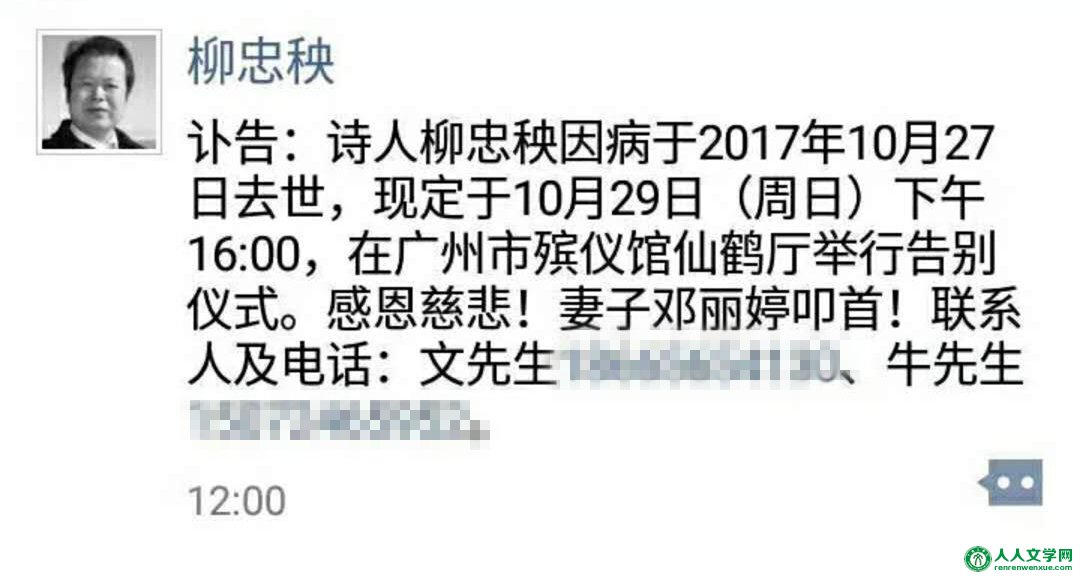 湖北日报客户端讯(全媒体记者彭磊)10月28日中午,诗人柳忠秧的朋友圈发出这样一条“讣告:诗人柳忠秧因病于2017年10月27日去世,现定于10月29日(周日)下午16:00,在广州市殡仪馆仙鹤厅举行告别仪式。感恩慈悲!妻子邓丽婷叩首!”并留下联系人及电话。 该信息在诗人圈迅速传播,事发突然,引发众人惊愕。记者马上拨通柳忠秧本人的手机,接电话自我介绍为柳的大嫂,“消息是真的。柳忠秧的爱人因为过于悲痛,无法接电话。我代为她接电话。”她提到,柳忠秧身体底子本来不错,“是心机梗塞方面的突发病症。” 随后,柳忠秧的好友、诗人周瑟瑟也向记者证实,“我也打通了他的电话,他的大嫂也跟我说了这个不幸的消息。是10月27日下午三点突发,未能抢救过来。这个消息令人很难过。”记者也从作家伍立杨那里证实了该消息。
