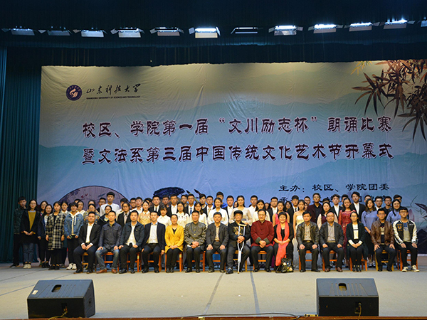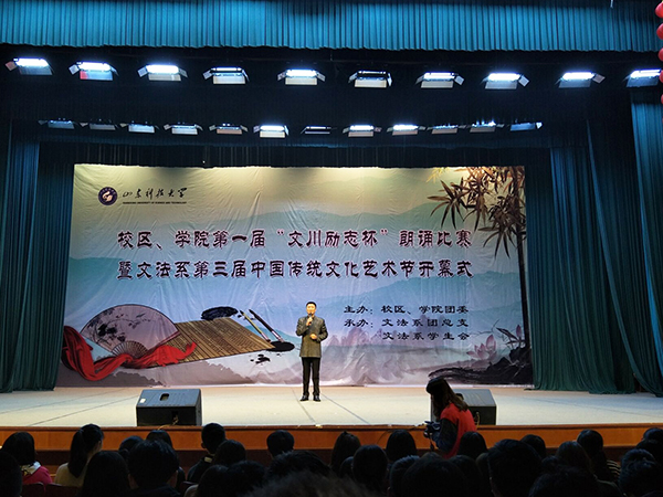 人人文学网讯:10月27日,由校区、学院团委主办,文法系团总支、学生会承办的校区、学院第一届“文川励志杯”朗诵比赛暨文法系第三届中国传统文化艺术节开幕式在礼堂隆重举行。著名诗人文川老师、山东广播电视台节目主持人王乐斌老师、泰安电视台国家一级导演李传泰老师和国家级骨干教师徐岚老师应邀出席并献上精彩的朗诵节目,校区、学院团委副书记朱庆豪、文法系党总支副书记刘相明、团总支书记郭涛林、各系团总支老师及文法系优秀校友蔡照坤与1000余名同学共享晚会盛宴。 开幕式分为高山流水、生死契阔、寸草春晖、赤子情深四个部分,以朗诵加歌曲的形式呈现,各成其特色。首先由文法系团总支老师郭艳培介绍第三届中国传统文化艺术节的主要内容。本次艺术节为期两个月的时间,分为“指上乾坤”“古韵流芳”“出口成章”和“熏陶渐染”四个板块,并开展10多项特色活动。随后,王乐斌老师上台致辞,亲切和蔼又不失幽默睿智,深情朗诵《沁园春 长沙》,勉励同学们树立崇高理想、开拓宽广胸怀。期间,参赛同学的表现可谓可圈可点,《再别康桥》描绘出清新如画的别离之景,《刑场上的婚礼》演绎出革命战争年代的美好爱情,《关雎》带我们重温经典,《我爱这土地》和《英雄》激起在场观众的满腔热血。此外,王乐斌老师朗诵《故乡》,道出在外游子思乡不归的悠长思绪;徐岚老师改编的《雨儿》,演绎出子女对母亲深沉朴素的爱;文川老师两次登台朗诵《为精彩呐喊》更是将晚会推向高潮,掌声经久不息,同学们被他的朗诵深深吸引,更为他严格要求自己、追求完美的品质所折服。最终,法学17-1班张震、杨涵朗诵《刑场上的葬礼》和人力资源17-2班李宗冕、国际商务17-1班杨凌宇朗诵《祖国,我亲爱的祖国》斩获一等奖。