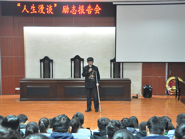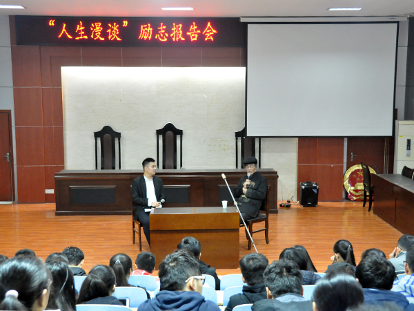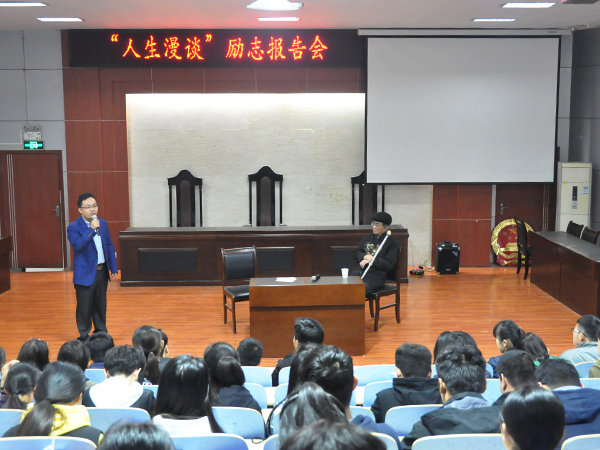 10月28日上午,著名诗人文川应邀在模拟法庭作了题为“人生漫谈”的励志报告会。报告会由2017届优秀校友、现就职于北京《新京报》的蔡照坤主持,文法系团总支书记郭涛林、团总支老师高山及2017级新生聆听报告会。 本次报告会采用央视“开讲啦”的形式,分为励志演讲和现场问答两个环节。首先,蔡照坤借“什么是‘漫谈’”引出报告会的主题,并与同学们分享自己大学的成长历程,重点谈到他创办大学生演讲朗诵协会的过程及其意义。随后,文川老师上台进行演讲。他以丰富的人生阅历阐述出学习与生命的重要性。他说:“这个世界创造出一个你,你也要去创造一个世界。中断了学习就中断了生命,拒绝了学习就拒绝了成长。”期间,他朗诵自己过去所作的《与你同行》、《青春无悔》和《哈哈镜》等诗歌。文川老师对同学们提出以下建议:一、当代大学生要有方向、目标和定位,切忌幻想,要有理想;二、待人诚恳,拥有真诚才能与人为善;三、要做个有大爱、有智慧的人。提问环节,文川老师详细的回答同学们提出的问题,给予同学们指导意见。最后,报告会在蔡照坤朗诵的《再唱祖国万岁》中落下帷幕。