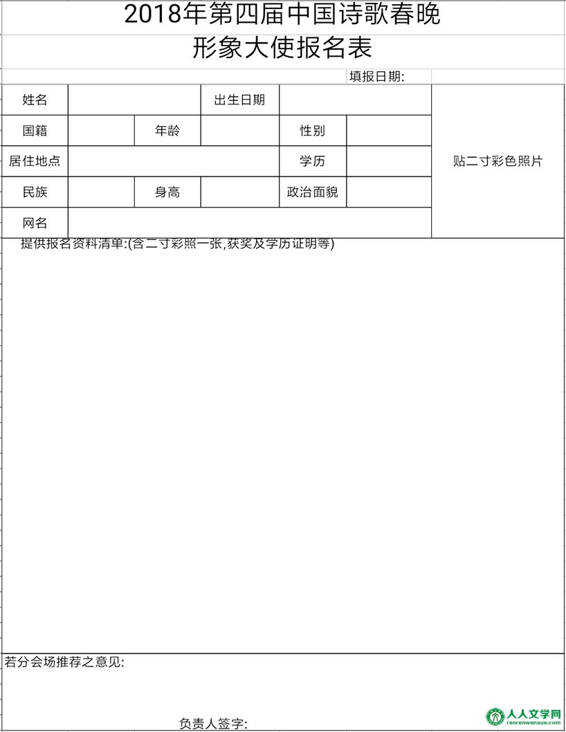 一、对象全球热爱以及汉语创作诗歌的华裔。 二、报名条件 1、拥护中国共产党的领导,自愿当选中国诗歌春晚形象大使,推广诗歌文化。中共党员、企业家、大学生优先考虑。 2、品行优良,作风正派 3、身体健康,五官端正,形象较好。 身高:男生在1.70米以上,女生在1.60米以上为宜。 4、喜爱诗歌及文学等,具有一定的文学修养。大专以上学历。 5、年龄限制:18岁-50岁。 6、发表过诗歌、出版过诗集,获国家及省部级奖励及具有影响力者优先考虑。 三、报名要求 1、个人可直接向中国诗歌春晚组委会报名。 报名初审费800元/人。 2、各分会场也可进行海选后推荐到组委会,并将其相关资料及分会场推荐意见一并报组委会。被推荐选手报名初审费800元/人。 3、凡报名选手(含分会场推荐选手)经初选合格选手,进入终选。 4、进入终选选手交纳评审费、培训费1000元/人。并对进入终选选手进行推广宣传。 5、所有报名者,所报资料均不予退还。 6、凡进入终选者,每位选手赠送中国诗歌春晚门票一张(如外地不赶能到北京,票可以转让)。 四、推选确定 从即日起一一12月10日为报名期限。组委会最后确定评选结果并予以公布。 五、选手报名提供资料 1、近一年内免冠二寸彩色照片(一张贴报名表上,一张评审时用。)同时提交工作或生活照(6寸)两张。 2、身份证复印件两份(正反面均复印在A4白纸上) 。 3、获奖、刊物出版等资料的复印件各一份(若是书籍,只复印封面或书内本人作品) 。 4、参加演出等有关活动的视频、照片等。 五、有关事宜 1、所提供资料快递至北京组委会一份。 2、同时进行网上报名,并提供上述资料内容一份。 3、所有报名选手交通、食宿费用均请自理。 4、报名选手也可携报名资料与组委会专职人员进行面试、沟通等。 5、凡进入终选者,均在中华文化财富网、人人文学网等媒体进行推介。 6、最后确定的形象大使(含文化传播大使、文化国际传播大使)将成为签约诗人。 7、未尽事宜,另行通知。 六、中国诗歌春晚形象大使推选 联系人: 盛万山(网名:万水千山) 手机号:13681593136 (微信号) 报名邮箱:cwdashi2018@163.com 报名资料快递地址:北京市朝阳区安立路68号阳光广场D3一一902房间 (快递件封面标识:“形象大使”字样。) 报名费用:RMB800元 银行支付方式: 户名:北京泛舟横渡文化传播有限公司 账号:11090101040025006 开户行:中国农业银行股份有限公司北京通州支行营业部 微信支付: 组委会窦涛:13811590887 ![]() 七、本《办法(试行)》解释权归中国诗歌春晚组委会 ( 文件编号:中诗办2017--09号文)。