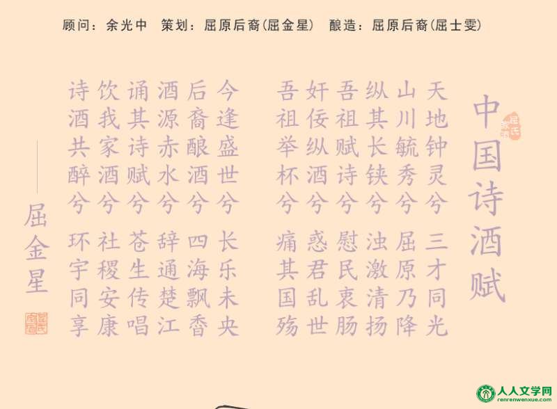 中国诗歌春晚战略合作伙伴——中国诗酒![]() (中国诗歌春晚总策划,著名辞赋家屈金星为中国诗酒作赋) ![]() (华语诗坛泰斗、诺贝尔文学奖提名者洛夫为中国诗酒题写酒名) ![]() |