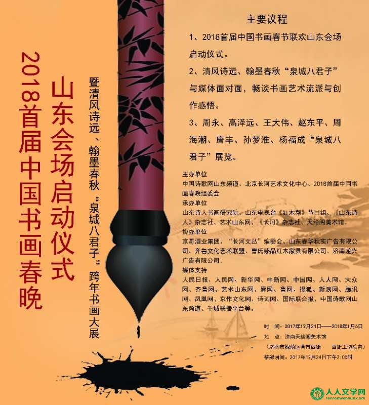 2018首届中国书画春晚山东会场启动仪式暨清风诗远、翰墨春秋“泉城八君子”跨年书画大展将于2017年12月24日下午2:00时在济南天绘阁美术馆拉开帷幕。届时,8位书画艺术家与媒体面对面,畅谈艺术与人生,精彩瞬间,不容错过。![]() ![]() ![]() ![]() ![]() ![]() ![]() ![]() ![]() ![]() ![]() ![]() |