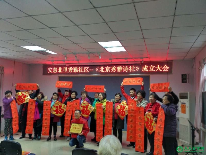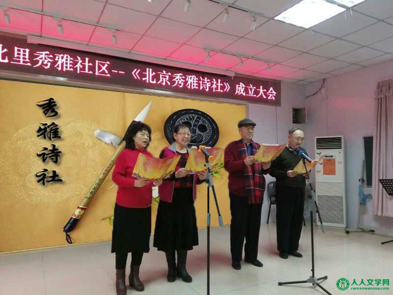 ![]() 诗社的第一课就是教授诗人曹大德《中国诗歌简史》的诗演讲,接着是进居民社区入户送春联贺年; 迎两会、庆三八的军旅夫妇邸维臣、王淑芳诗歌歌舞表演;和社区居民联手的庆五一、庆五四《放歌中国共产党 放歌五四青年节》诗歌表演大会、老红领巾欢庆六一,秀雅社区诗歌声朗朗,诗歌秀雅,诗意社区。 ![]() 教授、作家、诗人、工程师、医务工作者、老妪、社区工作者,都来参加北京秀雅诗社,诗社社员已过半百,是呀,秀雅社区爱诗歌,诗歌唱响秀雅社区。吟诗秀雅社区百姓欢乐! ![]() 北京秀雅诗社荣幸聘请了中国诗歌春晚专家屈金星、冰峰、梅尔、北塔、洪烛、眉凌、刘知白、王长征为顾问;聘请了2017第三届中国诗歌春晚形象大使刘雅阁为北京秀雅诗社形象大使。北京秀雅诗社全体会员受到极大鼓舞和鞭策! ![]()