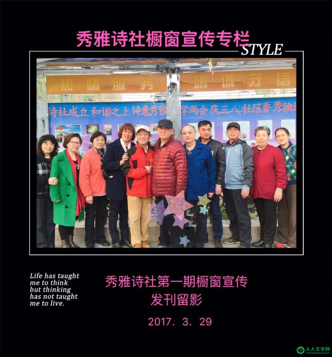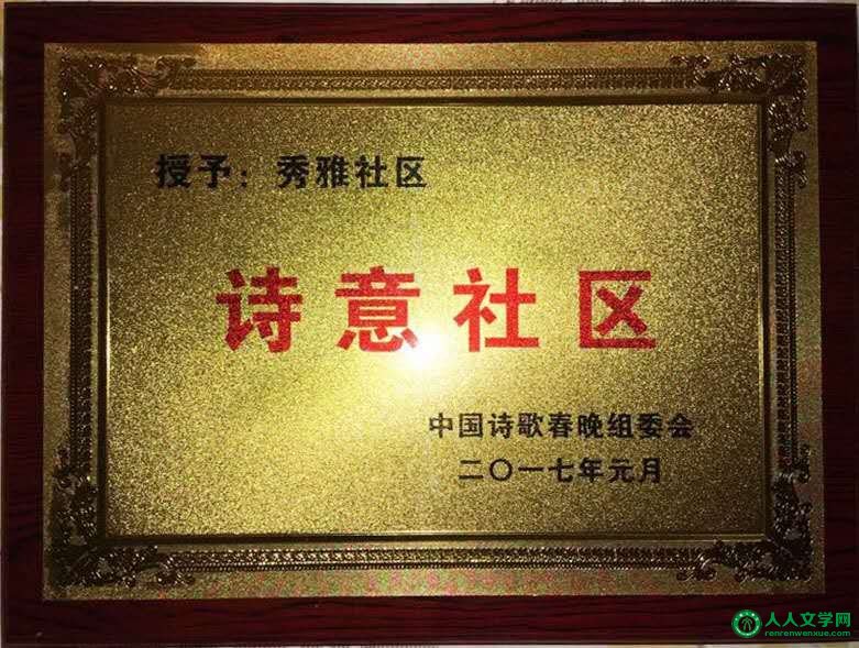 阳光普照,秀雅社区的文化沃土,滋润诗歌百花,秀雅社区党委书记董红艳同志,提出“崇礼仪、尚仁和,秀风采”,她带领党委大力推动社区文明活动的蓬勃开展,去年年初,社区副主任郎艳枝代表社区大力支持喜爱诗歌的清华学子盛万山,联系了喜爱诗歌的中国人民大学学子曹大德、北京军区转业干部邸维臣、王淑芳和何秋兰、宁秀茹、胡艳秋、肖本阳几个人座谈,组织了北京秀雅诗社。诗社的宗旨就是面向社区、服务居民,投入社区,自身快乐,服务社区、奉献真情。在2017年第三届全国诗晚上,社长盛万山欢欣地接受了全国第一块"诗意社区"牌匾。