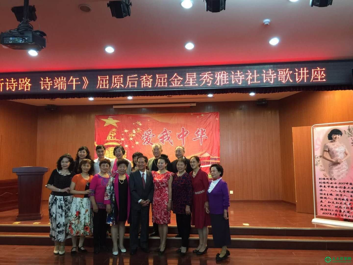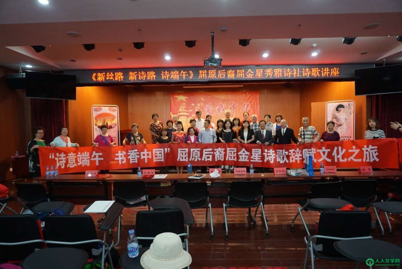 在"一带一路"国际合作高峰论坛即将召开之际的5月9日,屈原后裔、知名诗人、辞赋家、中国诗歌春晚总导演屈金星来亲临北京秀雅诗社讲授《新丝路、新诗路、诗端午》,从黄帝元妃嫘祖讲到丝绸起源及汉唐丝绸之路;从诗经、楚辞,讲到中华传统文化传承;从端午节起源讲到中国文化、中华文化自信、中华民族复兴;从屈子忧国忧民、责任担当,讲到习主席提出的"一带一路"伟大战略意义和世界意义。他提出要在新丝路上书写新的伟大史诗的新诗路。气势磅礴,振奋人心,点出了"新丝路 新诗路 诗端午"主题,为北京秀雅诗社指明发展方向。![]() 年逾七旬的军旅诗人邸维臣激动地诗说:“浩瀚夜空望金星,熠熠闪光警世人,勿忘国耻挺胸立,世界之林我精英。”教员女诗人胡艳秋写诗《金星闪烁》:“诗歌春晚开先河,草原诗会妙运作,诗意论坛推高峰,高屋建瓴大气魄。” 这就是中国诗歌春晚总导演屈金星大师,一竿子插到底,亲下基层授课,不仅事迹感人,而且中国诗歌春晚的甘甜露水直接撒播基层,大大促进了草根诗社——北京秀雅诗社的茁壮成长。 ![]()