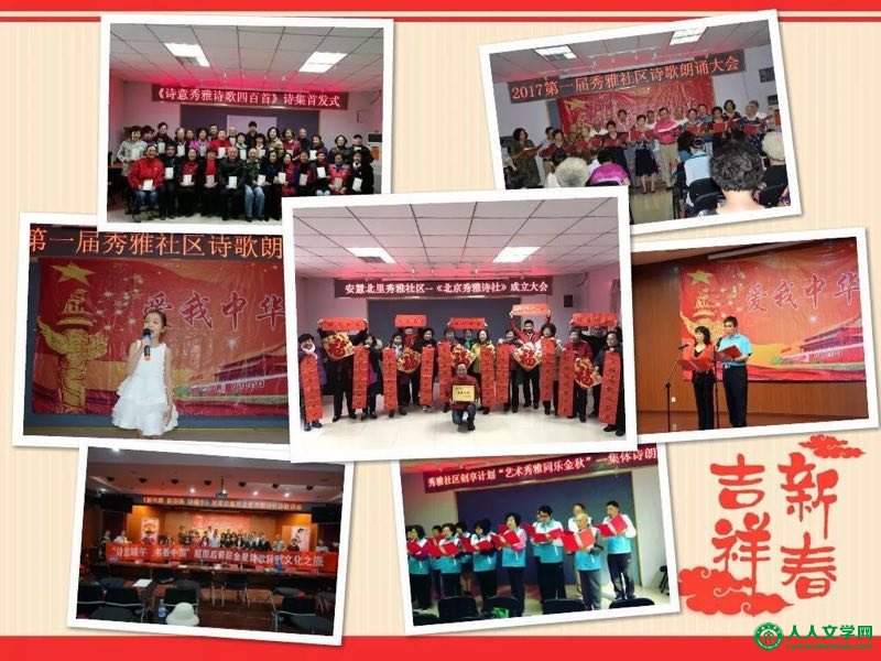 北京秀雅诗社紧紧围绕社区中心工作,开展诗歌文化活动。围绕年节节庆开展诗歌朗诵活动,丰富、活跃了社区的群众文化生活。特别是配合社区纪委,开展了庆祝中国人民解放军建军90周年茶话会活动,这是社区有始以来第一次邀请全社区复转复员军人,用诗歌等多种文艺形式庆贺建军节,向复转复员军人献花、赠送纪念品和生日蛋糕,复转复员军人激动地说建军节就是我们的生日,今天的生日活动终生难忘。他们激动地上台朗诵、唱歌,台上台下一片欢腾,军民团结如一家,试看天下谁能敌?诗社还参加了朝阳区《提高全民健康素质》诗歌朗诵话动和全国夏青杯诗歌朗诵大赛活动。![]() 诗社引领社区诗歌文化,在诗社影响和带动下,社区的各区域普遍开展了用诗歌迎接和庆祝党的十九大话动,去年8月10日,秀雅社区有史以来举行了第一届2017年秀雅社区诗歌朗诵大会,有六七十人朗诵了40多首诗歌节目,年长的八十余岁,年幼的五六岁。年逾八旬的老妪,饱含深情的朗诵了志愿为社区热情服务;74岁的老年医生常瑞霞朗诵了著名主播人白岩松的诗作《当你老的时候》,深诉了老有所养、老有所学、老有所为。六岁的莫若青朗诵了《祖国赞》,赢得了全场阵阵掌声。五区域近20人的集体朗诵《前进的五区域》,讴歌了社区居民团结奋进,改变区域面貌,受到全场的鼓掌欢迎。全国诗歌春节晚会执行主席屈金星,发来贺信,热情歌颂社区诗歌朗诵大会是一种创新,必将推动整个社区乃至全国社区诗歌文化运动的蓬勃发展。 ![]()