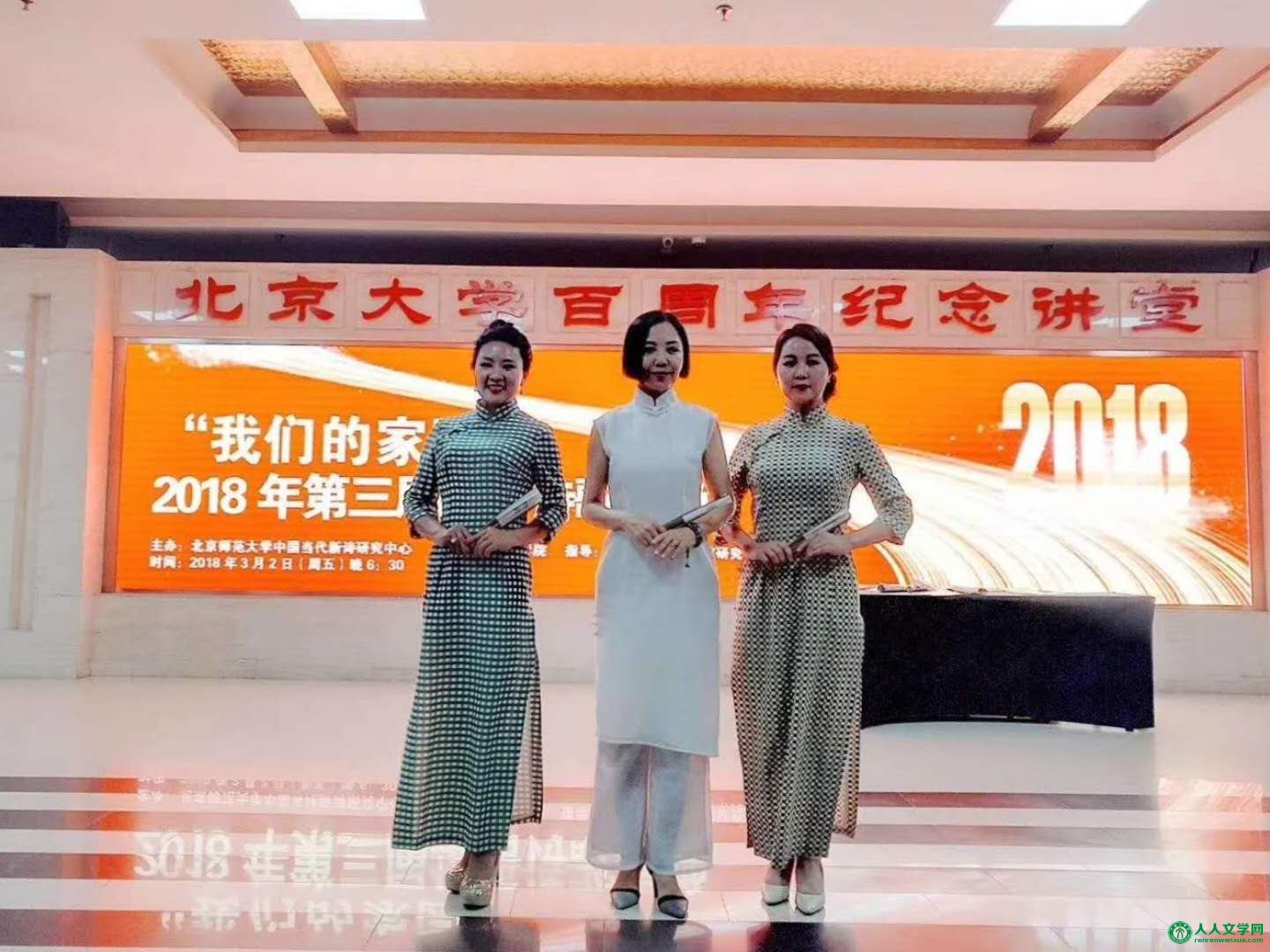 在北京大学百年讲堂举行的第三届华语诗歌春晚上,著名作家、诗人黄亚洲老师的诗歌《西湖灯光秀》受邀在现场由朗诵艺术家朗诵,并由三位女诗人若离、刘雅阁和阿B伴舞及走秀。