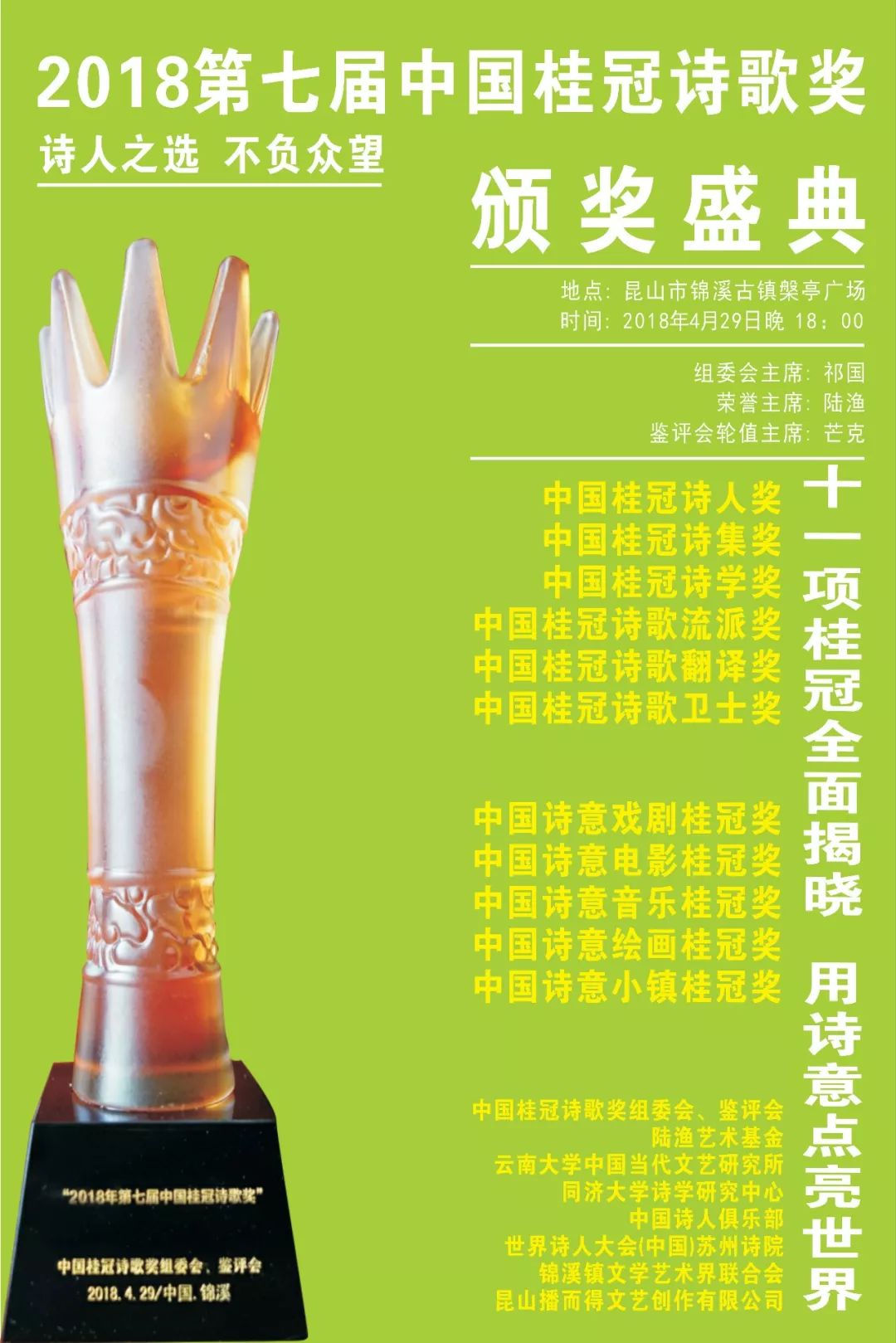 中国桂冠诗歌奖/诗意奖评选活动,由云南大学中国当代文艺研究所、同济大学诗学研究中心、中国诗人俱乐部、世界诗人大会(中国)苏州诗院、锦溪镇文学艺术界联合会、陆渔艺术基金、播而得文艺创作有限公司共同联办。 |