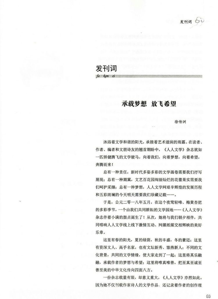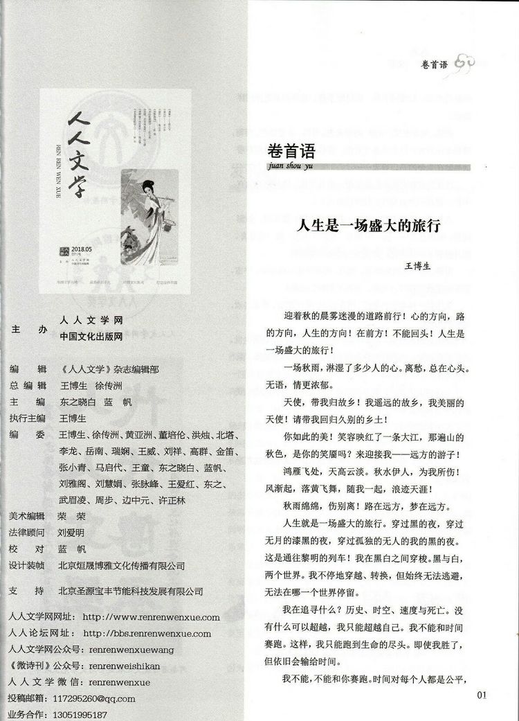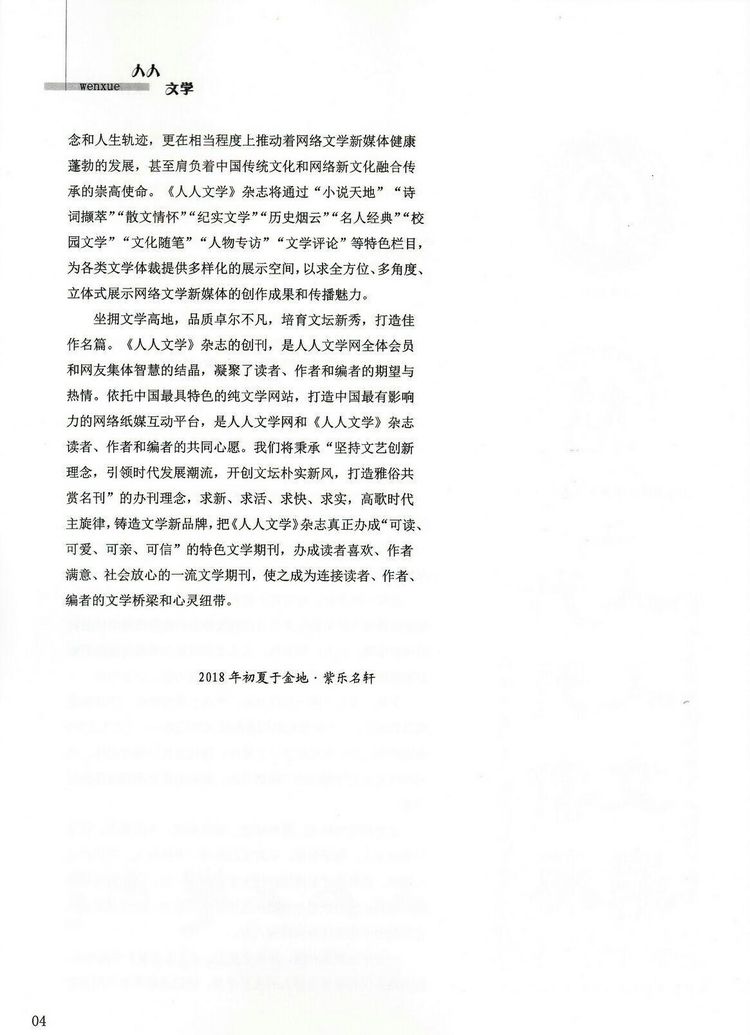 文学曾用夏季的痴情与狂热拥抱爱情,生命与理想;也眷恋着痛苦与忧伤,苦闷与彷徨;当赤诚与梦想,忠贞与执着拥抱,当失意与落寞接吻,当呐喊与悲壮碰撞的时候,我们满怀着激情与豪迈畅想生命的温馨,迎接时代的宁馨儿——《人人文学》那第一声嘹亮地歌唱,既是昂扬的告白,也是庄严的宣言,在百舸竞渡的多种媒体交互的时代,《人人文学》秉持传统的衣钵,搬演时代的新声,一亲芳泽。