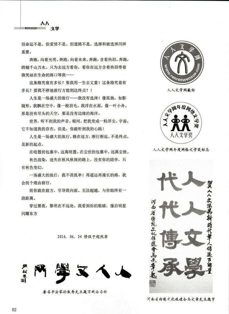 《人人文学》,人人都热爱文学。一刊在手,佳作皆有。祝贺《人人文学》走进人人心间,做好文化传承的排头兵。